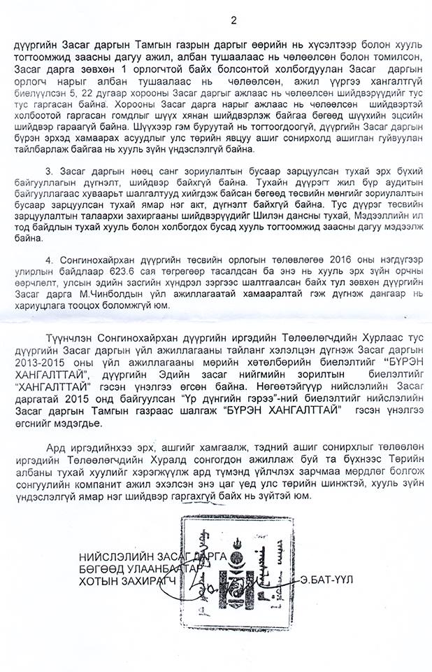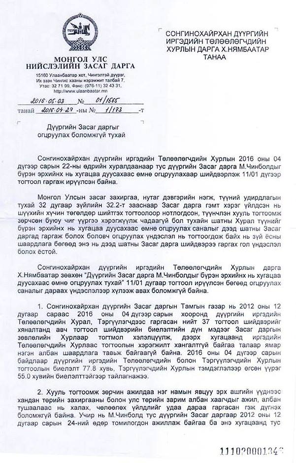 0e7735f91ed8ae2cgreatӨнгөрсөн дөрөвдүгээр сарын 22-ны өдөр Сонгинохайрхан дүүргийн ИТХ хуралдаж Засаг дарга М.Чинболдыг бүрэн эрхийнх нь хугацаа дуусахаас өмнө огцруулах шийдвэр гаргасан байдаг. Энэхүү шийдвэрээ Нийслэлийн Засаг даргад албан бичгээр хүргүүлсэн бөгөөд энэ тавдугаар сарын 03-ны өдөр Нийслэлийн Засаг дарга Э.Бат-Үүл уг албан бичгийн хариуг хуулийн хугацаанд нь хүргүүлсэн байна.