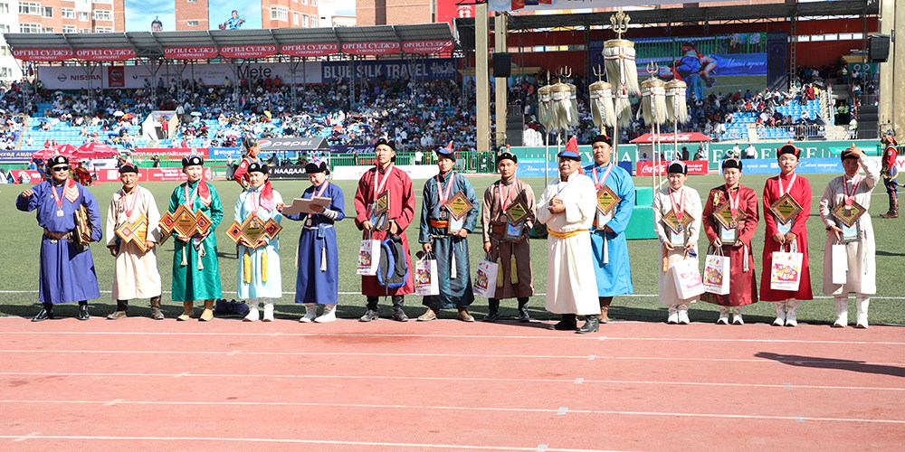 Энэ жилийн Үндэсний сурын харвааны эрэгтэй харваачдаас 40 сумнаас 39 сум онож түрүүлсэн Төв аймгийн Зуунмод сумын уугуул, Төв аймгийн Үндэсний сурын “Зуун мэргэн” холбооны харваач, Монгол Улсын спортын мастер, Аймгийн мэргэн Э.Цогбаярт Монгол Улсын “Мэргэн” цол, 38 сум онож хоёрдугаар байр эзэлсэн Баян-Өлгий аймгийн Буянт сумын уугуул, Орхон аймаг “Эрдэнэт үйлдвэр” ТӨҮГ-ын Ил уурхайн ажилтан, Хангарди спорт клубын харваач, Монгол Улсын спортын мастер, Аймгийн мэргэн Э.Ганчулуунд Монгол Улсын “Гарамгай харваач” цол, 37 сум онож гуравдугаар байр эзэлсэн Ховд аймгийн Дуут сумын уугуул, “Зэлмэ” сурын холбооны харваач, Монгол Улсын спортын мастер, Аймгийн мэргэн Д.Чулуунбатад Монгол Улсын “Гоц харваач” цолыг тус тус олголоо.
