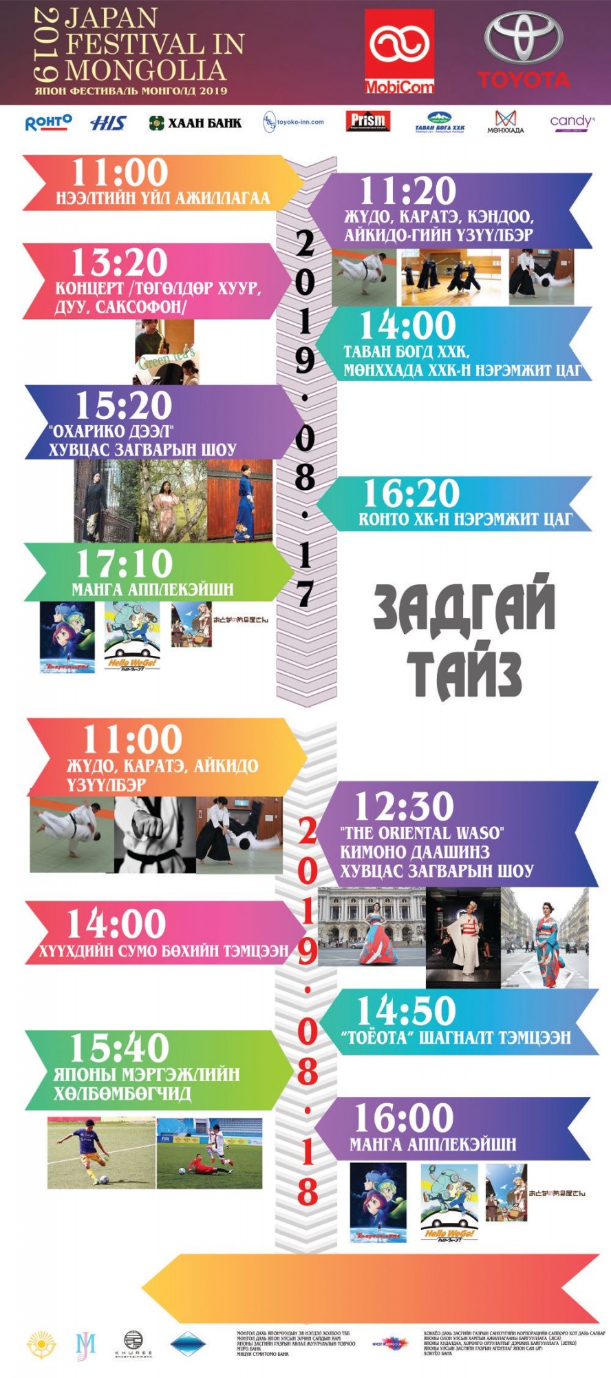 Тиймээс  Монгол дахь Япон Улсын элчин сайдын яам, Монгол-Японы хүний нөөцийн хөгжлийн төв, Японы олон улсын хамтын ажиллагааны байгууллага (JICA), Японы худалдаа, хөрөнгө оруулалтыг дэмжих байгууллага (JETRO), Япон сан (JF), Японы засгийн газрын аялал жуулчлалын товчоо (JNTO) зэрэг Япон Улсын засгийн газрын хэрэгжүүлэгч агентлагуудын дэмжлэгтэйгээр албан ёсоор Монгол дахь хамгийн том Японы соёлыг сурталчлах өдөрлөг болох “Япон фестиваль Монголд 2019”-ийг 8 дугаар сарын 17, 18-ны өдрүүдэд зохион байгуулах гэж байгаа билээ.