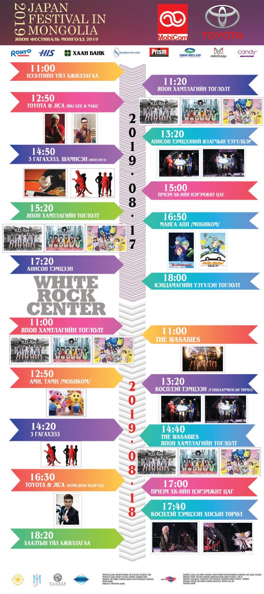 Энэ жилийн фестивальд урьд жилүүдийн өдөрлөгийн гол хөтөлбөрийн нэг болох косплэй тэмцээн, анимэний дууны тэмцээн болохоос гадна японы хамтлаг уран бүтээлчид ирнэ. Өмнөх жилийн Япон поп соёлын өдөрлөгт ирсэн Festive, Wonder Weed хамтлагууд ирэхээс гадна Японы топ 3000 хамтлагийн шилдэг 6-д багтах The World Standart хамтлаг хүрэлцэн ирэх юм. Түүнээс гадна компаниудын урилгаар Монголын хамтлаг, уран бүтээлчид ч гэсэн зочноор оролцож байгаа юм.