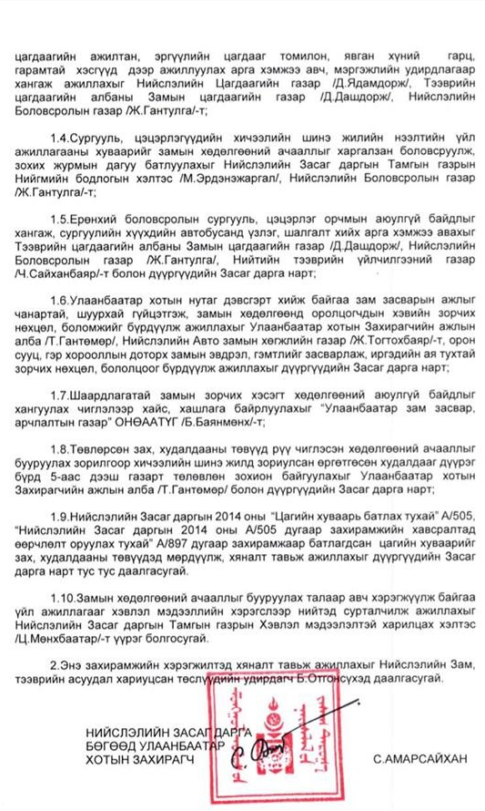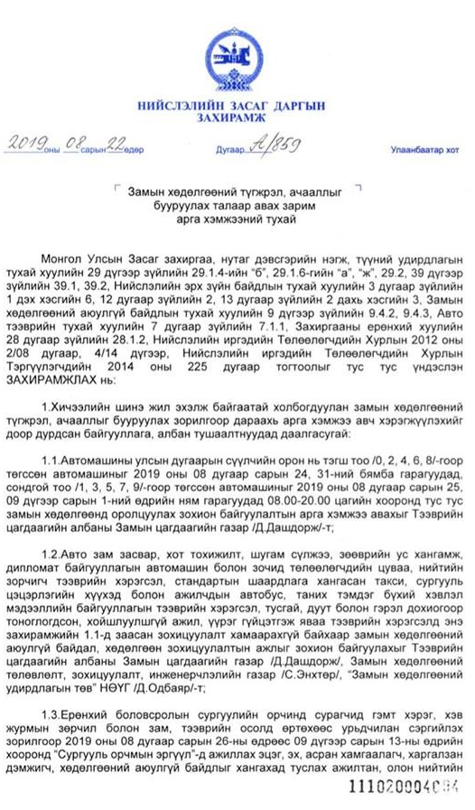 Захирамжийн хүрээнд хичээлийн шинэ жил эхлэж байгаатай холбогдуулан замын хөдөлгөөний түгжрэл бууруулах, сургууль орчмын хөдөлгөөний аюулгүй байдлыг хангах, шугам сүлжээний өргөтгөл засварын ажлыг эрчимжүүлэх ажлыг хэрэгжүүлэхийг холбогдох албан тушаалтнуудад үүрэг болгожээ.