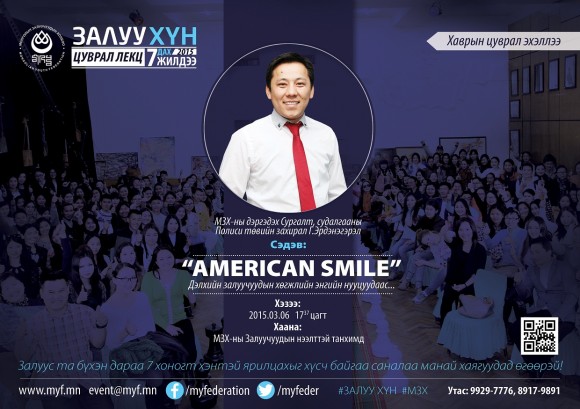 65b10d334e61ef7c78c72a161c19ff38Монголын Залуучуудын холбооноос уламжлал болгон зохион байгуулагдаж ирсэн “Залуу хүн” цуврал лекц энэ долоо хоногийн баасан гарагт эхлэхээр болж анхны зочноор МЗХ-ны дэргэдэх Сургалт, судалгааны “Полиси” төвийн захирал Г.Эрдэнэгэрэл уригдсан. Тэрээр “Аmerican Smile” гэсэн сэдвээр дэлхийн залуучуудын хөгжлийн энгийн нууцуудаас хуваалцхад  бэлэн  болсон байна.  Тэгвэл энэхүү лекцэнд хүрэлцэн ирж дэлхий дахины  залуусын  хөгжлийг тодорхойлж  буй  энгийн нууцуудаас хуваалцахыг хүссэн оролцогчдыг бүртгэж эхэлжээ. “Залуу хүн” цуврал лекц нь 7 дахь жилдээ салбар  бүрийн амжилтаараа манлайлагч  залуусыг урьж оролцуулан оюутан залуус, ажилтан  албан хаагч  гээд  сонирхсон  хүн бүрт нээлттэй, үнэ төлбөргүй  зохион байгуулагддагаараа онцлог юм. Орчин үеийн  залуус  өөрийнхөө оюунд хөрөнгө  оруулж,  мэдлэгийн  цар хүрээгээ тэлэх хүсэл сонирхолтой болсон  өнөө  цагт нүдээ  олсон залуусын хүссэн хүлээдэг лекцийн нэг болоод байгаа юм. Энэ ч утгаараа оролцогчдын тоо жилээс жилд нэмэгдэн, олон залуус  хамрагдаж оюуны цараагаа тэлэх болсон. Энэ жилийн хувьд уг лекцэнд суухыг хүссэн залуусыгhttps://docs.google.com/forms/d/1hm1C-F4OCVHeN44PawzJQO-EsEkc-mHe_Q0dsDeiDJ0/viewformгэсэн хаягаар бүртгэж байгаа ба мэдээж  суудлын тоо хязгаартай гэдгийг зохион байгуулагчид дуулгасан. Тиймээс  залуус  та  бүхэн  амжиж бүртгүүлээрэй.
