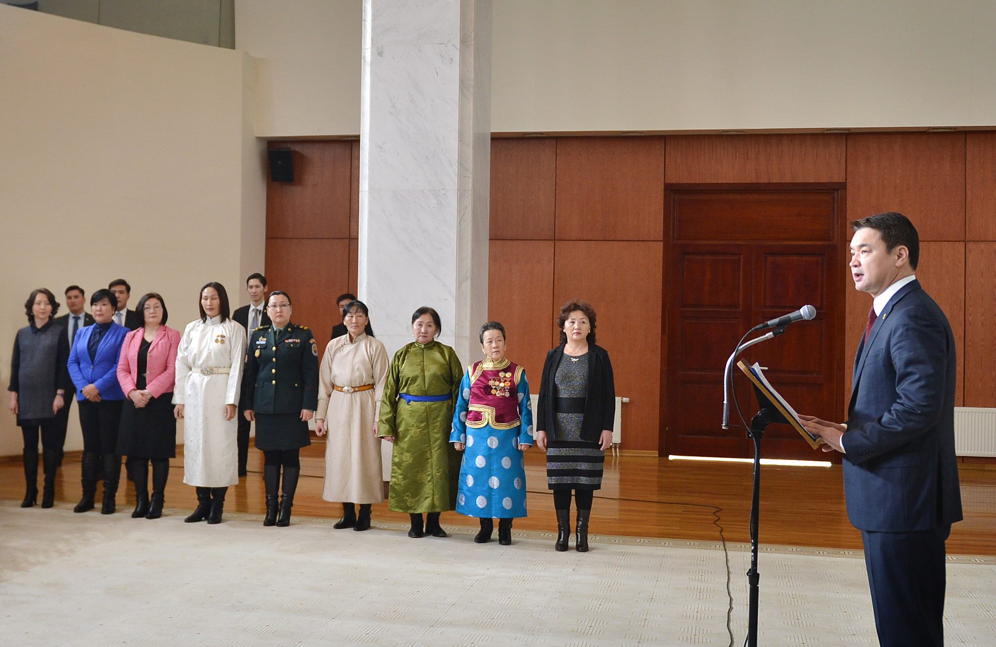Ерөнхий сайд Ч.Сайханбилэг Олон улсын эмэгтэйчүүдийн эрхийг хамгаалах өдрийг тохиолдуулан Монголын мянга мянган ээж, бүсгүйчүүдийн төлөөлөл болгон Сангийн яамны нэгдүгээр орлогч сайд асан, Монгол Улсын гавъяат эдийн засагч, шинжлэх ухааны доктор, профессор Б.Долгормаа, Монголын Эмэгтэйчүүдийн холбооны тэргүүн Ж.Эрдэнэчимэг, идэр залуу насандаа их мастерийн зэрэгт хүрч, эх орныхоо нэрийг мандуулсан Үндэсний шигшээ багийн тамирчин, Шатрын олон улсын хэмжээний мастер Т.Батчимэг,2014 оны Азийн Пара наадмын жүдо бөхийн аварга, ОУХМ Н.Алтанцэцэг, эрдэм боловсролтой Монгол хүнийг сурган хүмүүжүүлэхэд үнэтэй хувь нэмэр оруулж буй “Гэгээрэл” бүрэн дунд сургуулийн бага ангийн багш Т.Цэрэннадмид, Хүүхэд гэр бүлийн “Өнөр бүл” төвийн багш Т.Ганбат, “Сэргэлэн жаалууд“ цэцэрлэгийн эрхлэгч О.Оюун, Эрүүл чийрэг Монгол хүний энхийн манаанд зүтгэж буй Клиникийн профессор, “Сүхбаатар” нэгдсэн эмнэлгийн Хүүхдийн тасгийн эрхлэгч Г.Оюунчимэг, Эх орноо батлан хамгаалахын төлөө тангараг өргөсөн Зэвсэгт хүчний Жанжин штабын Энхийг дэмжих ажиллагааны хэлтсийн ахлах мэргэжилтэн Н.Нямжаргал,төр, ард түмнийхээ амар тайван амьдралыг сахин хамгаалах үүргээ амжилттай биелүүлж яваа Улаанбаатар хотын Цагдаагийн газрын ахлах мөрдөн байцаагч С.Булганцэцэг, Гадаад, дотоод худалдааны “НОВА ТАМИР” ХХК-ийн ерөнхий менежер Б.Отгонбулаг, цэвэр, цэмцгэр хотын төлөө чин сэтгэлээсээ хөдөлмөрлөж яваа Нийтийн үйлчилгээний Улаанбаатар нэгтгэлийн Зам талбайн үйлчлэгч Б.Ариунаа, Ц.Баттогтох, ШУА-ын Химийн технологийн хүрээлэнгийн ахлах ажилтан, шилдэг залуу эрдэмтэн Н.Эрдэнэчимэг, Монголын үндэсний телевизэд тасралтгүй 29 дэх жилдээ ажиллаж байгаа ММ агентлагийн ахлах зураглаач Г.Байгальмаа, Алдарт эхийн одонт ээжүүдийн төлөөлөл, найман хүүхэд төрүүлж өсгөсөн Д.Янжмаа, таван хүүхэд төрүүлж өсгөсөн Ж.Сугар, Д.Хишигт гуай, авъяас чадвараараа бусдыгаа манлайлсан Дэлхийн Франц хэлтнүүдийн тэмцээний 3 дугаар байрын шагналт МУИС-ийн оюутан Б.Дөлгөөн, “Би бүжигчин болохыг хүснэ” улсын 2 дугаар уралдааны тэргүүн байрын шагналт 86-р сургуулийн 9 дүгээр ангийн сурагч Х.Хулан нарыг хүлээн авч уулзан баяр хүргэлээ.