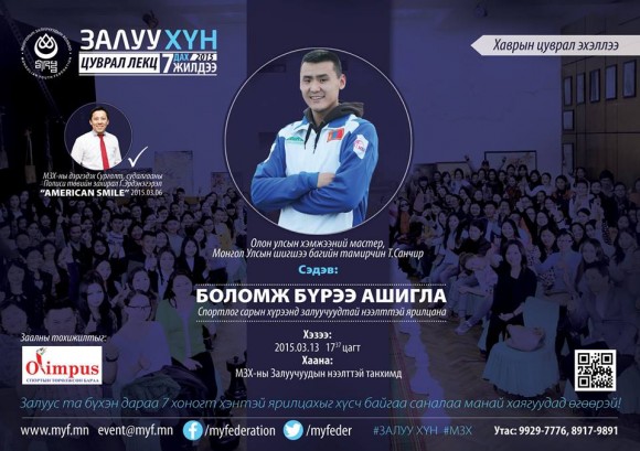 Инчёны Азийн наадамд шөвгийн наймд шалгарсан түүхэн амжилтыг үзүүлж Монголын шигшээгийн нэрийн хуудас болсон Т.Санчирын уран чадварлаг тоглолт, олон улсын дасгалжуулагчдыг гайхашруулж, бидний бахархалыг 2014 онтой мөнхөлж байсныг олон хүн санаж байгаа бизээ. Мөн тэрээр оны өмнөхөн МЗХ-оос зохион байгуулдаг Next stop наадамд оролцож МЗХ-ны нэр хүндтэй шагнал болох “Амжилтын Алтан од”-оор энгэрээ мялаасан, “Оны онцлох хүн” болсон гээд л түүний амжилтын цуваа тасраагүй явна. Иймд түүний амжилтын түүхээс хуваалцаж сонирхолтой яриа өрнүүлэхийг хүссэн залуус 2015 оны 3 сарын 13-нд МЗХ-г зориорой. Лекц яг цагтаа буюу 17:37 минутандаа эхэлнэ. Энэ удаагийн тайзны засалтыг “Olimpus” спортын төрөлжсөн барааны их дэлгүүр дэмжин ажиллах юм байна.