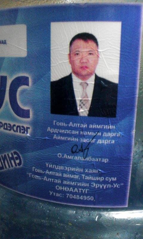 Говь-Алтай аймгийн Засаг дарга О.Амгаланбаатар Говь-Алтай аймгийн “Эрүүл ус” орон нутгийн өмчит аж ахуйн тооцоот үйлдвэрийн газарт үйлдвэрлэсэн цэвэр усны савны шошго дээр “Бидний Алтай хөтөлбөр-Алтай нутгийн ард түмнийг эрүүл, аюулгүй ундны усаар хангахад сэтгэл зүтгэл гарган ажиллав. Говь-Алтай аймгийн Ардчилсан намын дарга, аймгийн Засаг дарга О.Амгаланбаатар” гэсэн бичвэр бүхий өөрийн цээж зураг, гарын үсгийг хэвлэн байршуулсан нь орон нутгийн өмчийн хөрөнгөөр хийгдэж байгаа ажил, үйлчилгээгээр дамжуулан өөрийн албаны болон намын сурталчилгааг хийсэн үйлдэл болох нь тогтоогджээ.