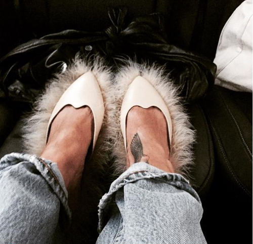Дуучин бүсгүй энэ гутланцрыг хөх жийнсэн өмдөөр тодосгож, Энтон Ваккареллогийн цамц, “Dsquared2”-ын арьсан хүрэм дээгүүр нь өмсчээ.