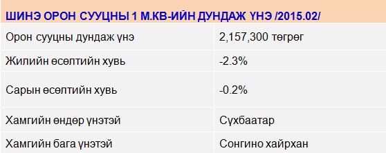 Шинэ орон сууцны 1 м.кв дундаж үнэ нь 2015 оны 2 дугаар сарын байдлаар 2,157,300 төгрөг болж өнгөрсөн оны мөн үетэй харьцуулахад 2.3 хувиар буурсан дүнтэй байна.
