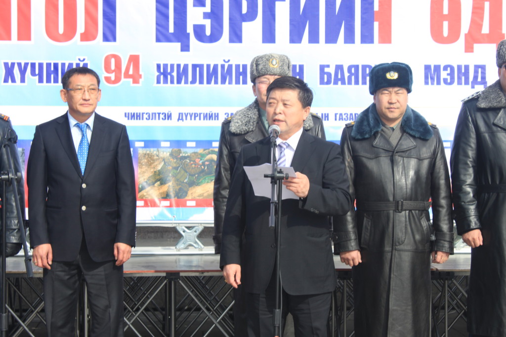“Монгол цэргийн өнгөрсөн одоо, ирээдүйг бахдам үйлсээрээ арвижуулан дархалж яваа Эрхэм хүндэт ахмад дайчид , чөлөөнд байгаа Генерал, Офицерууд, цэргийн үүргээ биелүүлж яваа ахлагч, байлдагч, Зэвсэгт хүчин, Хил, Цагдаа, Шүүхийн шийдвэр гүйцэтгэх болон Онцгой байдлын албаны нийт бие бүрэлдэхүүн Та бүхэндээ Зэвсэгт хүчин үүсэн байгуулагдсаны 94 жилийн ой, “Монгол цэргийн өдөр”-ийн мэндийг хүргэе?