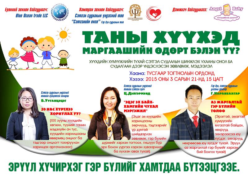 10258334_10205836544290483_642367507958506144_nМонголд анх удаа мэргэжлийн сэтгэл судлаачдын нэгдсэн “Таны хүүхэд маргаашийн өдөрт бэлэн үү” сэдэвт лекц 2015 оны 3-дугаар сарын 21-нд 15 цагаас Тусгаар тогтнолын ордонд зохион байгуулагдахаар боллоо. Манай улсын нийт хүн амын 75 хувь нь 35 хүртэлх насны залуучууд байдаг. Иймээс залуу гэр бүлүүдэд энхрий үрсээ хэрхэн зөв хүмүүжүүлэх талаар мэдлэг олгох зорилготой энэхүү лекцийг зохиохоор болжээ. Лекцийг энгийн үг хэллэгээр гадаад дотоодын сонирхолтой жишээ баримтан дээр тулгуурлан зөвлөгөө өгч, харилцааны сонирхолтой аргачлалуудыг эцэг эхчүүдэд зааж сургах гэх мэт хамгийн энгийн хэлбэрээр явуулах юм. Хүүхдэдээ хамгийн дотны хүн байхыг хүссэн хэн бүхэнд үүд хаалга нээлттэй ба өөрт хэрэгтэй, хэнээс ч асууж сураад олдохгүй үнэт зөвлөгөөнүүдийг энэдээс авах боломжтой юм. Энэ удаагийн лекцэнд мэргэжлийн, туршлагатай сэтгэл зүйчид оролцох юм. Үүнд: Сэтгэл судлалын үндэсний төвийн гүйцэтгэх захирал Б.Ууганцэцэг “хүүхдийг 20 нас хүртэл нь хориглосоор байх уу” сэдвээр Сэтгэл судлалын үндэсний төвийн сэтгэлзүйч Ц.Дэлгэрмэнд “Эцэг эх байх хамгийн чухал мэргэжил” сэдвээр Гэр бүл сэтгэл судлалын ухааны доктор Г.Наранбаатар “Аз жаргалтай гэр бүлийн төлөө” сэдвээр лекц уншина.