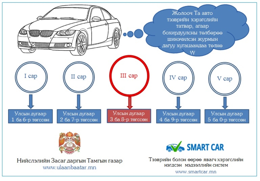Энэхүү зохицуулалтын дагуу автомашины улсын дугаар нь 3,8-аар төгссөн бол энэ сард албан татвар, төлбөр хураамжаа төлнө. Энэ жилийн хувьд нэг, хоёр дугаар сард төлөх жолооч нарын төлөлтийн хуваарь өнгөрсөн ч зургаадугаар сарын 1-нээс өмнө нөхөж төлөх боломжтой бөгөөд та энэ жилдээ торгууль шимтгэл төлөхгүй. Мөн та автомашиныхаа улсын дугаараас хамааран 4,5 сард төлөх хуваарьтай бол өмнө нь буюу урьдчилж энэ сард ч татвараа төлөх боломжтой. Эхний улиралд албан татвар, төлбөрийн төлөвлөгөөний гүйцэтгэл 88-97 хувьтай байна. Улирал дуусахад төлөвлөгөө бүрэн биелэх боломжтой гэж албаныхан үзэж байна. Авто тээвэр болон өөрөө явагч хэрэгслийн албан татвар, төлбөр хураамжаа төлөх нэг цэгийн үйлчилгээний зарим байршил, цагийн хуваарьт өөрчлөлт орууллаа. “Ухаалаг Улаанбаатар” хөтөлбөрийн хүрээнд “Smartcar.mn” мэдээллийн системийн хэрэглээг өргөжүүлж, нийслэлд бүртгэлтэй, идэвхтэй тээврийн хэрэгслийн нэгдсэн санг үндэслэн нийслэлийн Мэдээллийн технологийн газар, Татварын алба авто тээврийн хэрэгслийн албан татвар, төлбөрийг онлайн, интернэт, мобайл банкаар шууд төлдөг тогтолцоонд шилжүүлэхээр арилжааны банкуудтай хамтран төлөвлөгөө гарган ажиллаж байна. Одоогоор Улаанбаатар банк оношлогооны цэгүүд дээр байршин үйл ажиллагаа явуулж байна. Хэрэв хуульд заасан хугацаанд татвараа төлөөгүй тохиолдолд Замын цагдаагийн алба нь өөрийн эрх хэмжээ, хуулийн хүрээнд авто тээврийн эзэмшигчдэд хариуцлага тооцож, замын хөдөлгөөнд оролцуулахгүй байх хүртэл холбогдох хуулийн дагуу арга хэмжээ авна гэж Нийслэлийн ЗДТГ-ын Хэвлэл мэдээлэл, олон нийттэй харилцах хэлтсээс мэдээллээ.