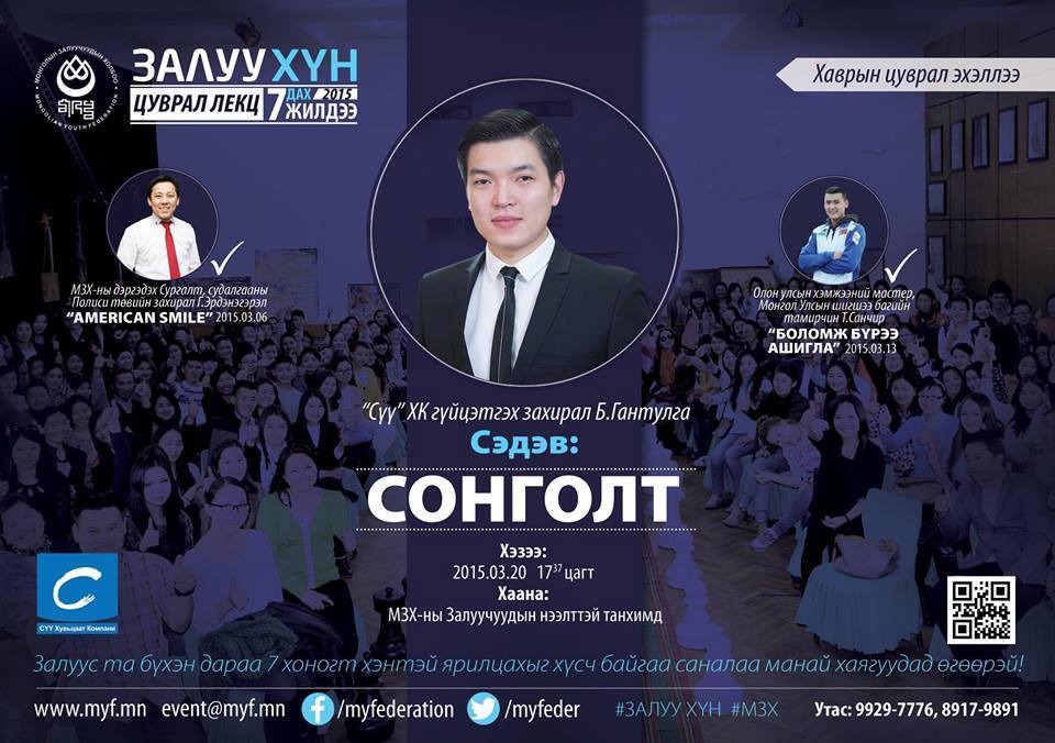 11075246_450730898414198_655586679_nМонголын залуучуудын холбооноос уламжлал болгон зохион байгуулдаг “Залуу хүн” цуврал лекцийн гурав дахь зочноор “Сүү” ХХК-ийн гүйцэтгэх захирал Б.Гантулга уригдлаа. Анхны зочноор МЗХ-ны дэргэдэх Полиси төвийн захирал Г.Эрдэнэгэрэл “Залуучуудын орчин үеийн хөгжлийн чиг хандлага” сэдвээр лекц тавьсан бол удаах зочноор Монголын шигшээ багийн тамирчин Т.Санчир уригдаж “Боломж бүрээ ашигла” сэдвээр оюутан залуустай нээлттэй ярилцсан. Тэгвэл энэ удаагийн зочноор үндэсний үйлдвэрлэгч ууган үйлдвэрүүдийн нэг “Сүү” ХХК-ийн гүйцэтгэх захирал Б.Гантулга “Сонголт” сэдвээр залууст лекц тавихаар болжээ.