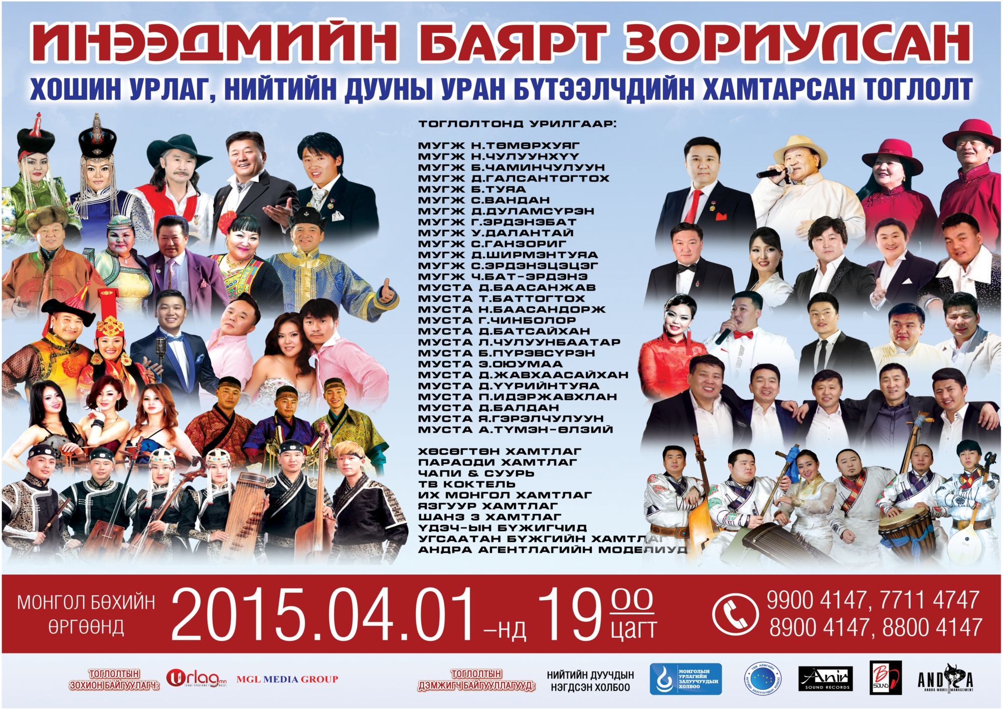Дөрөвдүгээр сарын 1-нд буюу “Инээдмийн баяр”-ын өдөрт зориулсан хошин урлаг, нийтийн дуу, элэглэл, хөгжим бүжгийн шилдэг уран бүтээлчдийн хамтарсан тоглолт эрийн хийморь мандаасан Монгол бөхийн өргөөнд 4 сарын 1-нд 19:00 цагаас ганцхан удаа болох нь ээ.