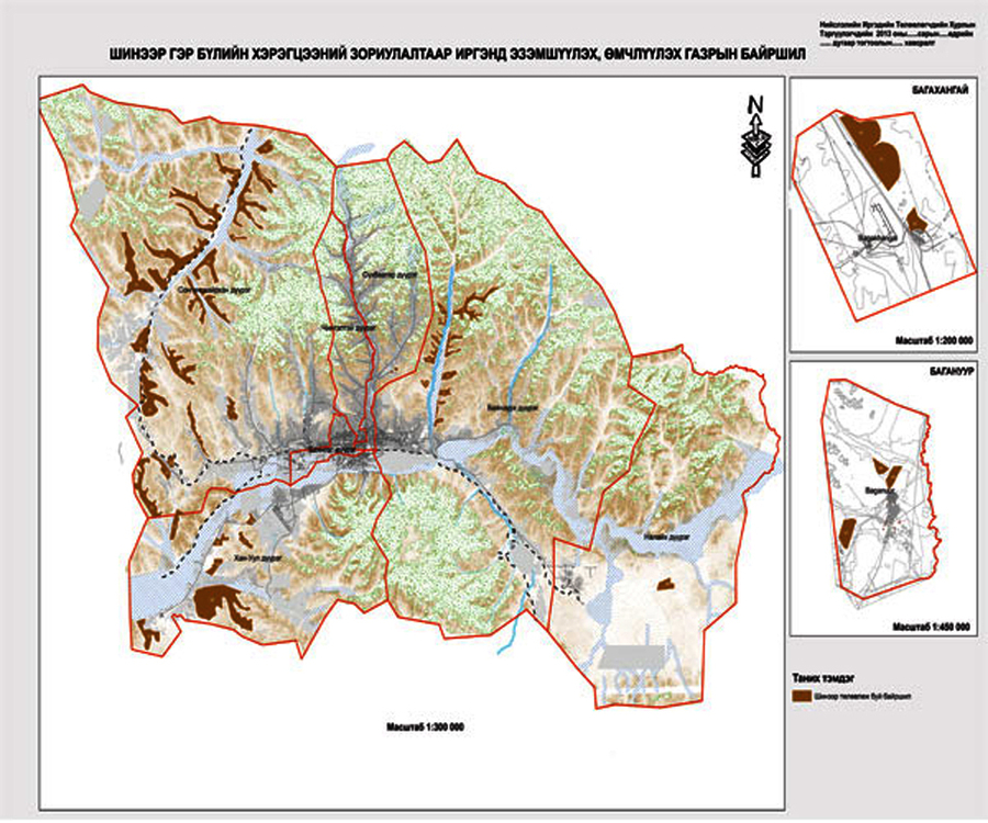 Нийслэлийн ИТХ-ын 2013 оны 05 дугаар сарын 30-ны өдрийн 10/39 дүгээр тогтоолоор гэр бүлийн хэрэгцээний зориулалтаар иргэнд өмчлүүлэх газрын байршил, хэмжээг тогтоосон. Тогтоолын дагуу Нийслэлийн Ерөнхий төлөвлөгөөний газраас Баянзүрх, Хан-Уул, Сонгинохайрхан, Сүхбаатар, Налайх, Багануур, Багахангай дүүргийн 52 байршлын нийт 15 309 га газрыг гэр бүлийн зориулалтаар иргэдэд өмчлүүлэхээр загвар төслийн зургийг боловсруулж, хаягийн зургийг батлах ажлыг гүйцэтгэсэн. Нийслэлийн ИТХ-ын Тэргүүлэгчдийн 2014 оны 06 дугаар сарын 26-ны өдрийн 100, 10 дугаар сарын 22-ны өдрийн 180 дугаар тогтоолоор гэр бүлийн хэрэгцээний зориулалтаар иргэнд өмчлүүлэх газрын нийт 49 байршлын ерөнхий төлөвлөгөөний загвар төслийг үндэслэн хаягийн зураг баталсан.