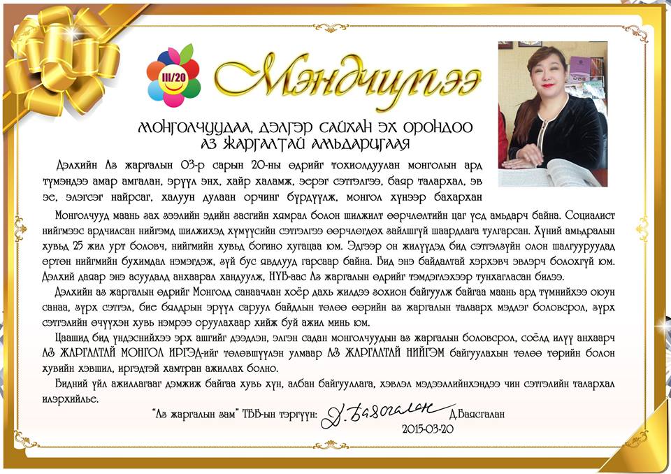 Өнөөдөр дэлхийн аз жаргалын өдөр. Энэ өдөртэй холбогдуулан “Аз жаргалын зам” ТББ-ын тэргүүн Д.Баясгалан мэндчилгээ дэвшүүллээ.