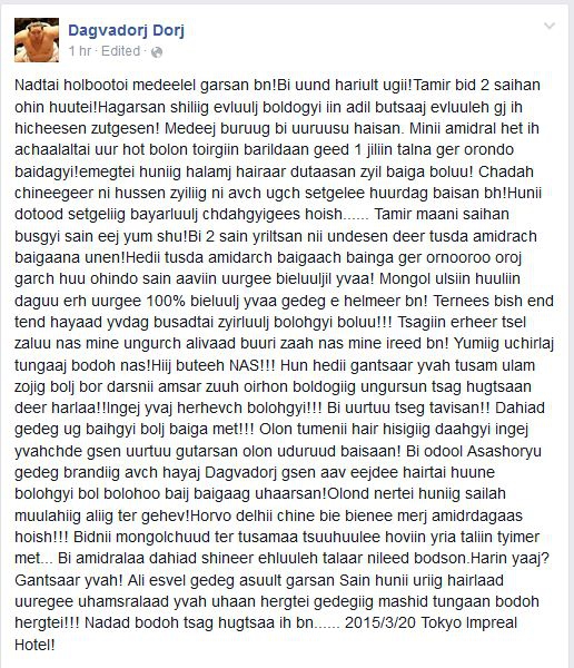 Би амьдралаа дахиад шинээр эхлүүлэх талаар нэлээд бодсон. Харин яаж? Ганцаар явах! Аль эсвэл гэдэг асуулт гарсан. Сайн хүний үрийг хайрлаад үүргээ ухамсарлаад явах ухаан хэрэгтэй гэдгийг машид тунгаан бодох хэрэгтэй. Надад бодох цаг хугацаа их байна. 2015/3/20 Tokyo Impreal Hotel!” гэжээ.