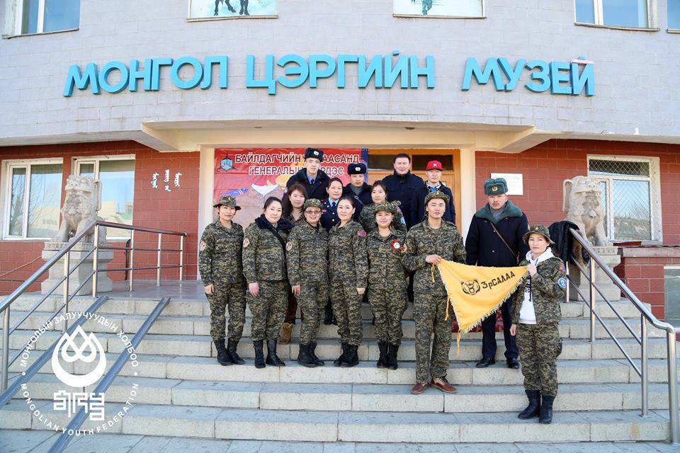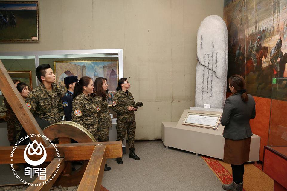 “Монгол цэргийн өдөр”-т зориулсан “Байлдагчийн халаасанд генералын мөрдэс” үзэсгэлэн Монгол Цэргийн музейд нээлтээ хийгээд удаагүй байгаа билээ. Тэгвэл Батлан хамгаалахын үе, үеийн төлөөллийн өмсөж, хэрэглэж байсан дүрэмт хувцас болоод Монгол цэргийн гайхамшигт түүх соёлтой Монголын Залуучуудын Холбоо, Батлан хамгаалах яамтай хамтран өнгөрсөн зун зохион байгуулсан Монгол-Орос залуучуудын “Дайчин нөхөрлөлийн замаар” аялалд оролцсон залуус танилцлаа. “Дайчин нөхөрлөлийн замаар” тойрон аялал нь эх оронч үзлийг залуучуудынхаа ухамсарт бат бөх суулгаж, эх оронч сэтгэлгээ төлөвшүүлэхэд онцгой ач холбогдолтой болсон билээ. Түүнчлэн олон хоног хамтдаа аялсан залуус ахан дүүс мэт нөхөрлөсөн. Тиймээс энэ удаад аялалд оролцсон залуус аяллынхаа хөгжилтэй дурсамжаас хуваалцаж , Монгол цэргийн дайчин замналыг өгүүлсэн түүхэн дурсгалт эд өлгийн зүйлсийг үзэж танилцсан юм.