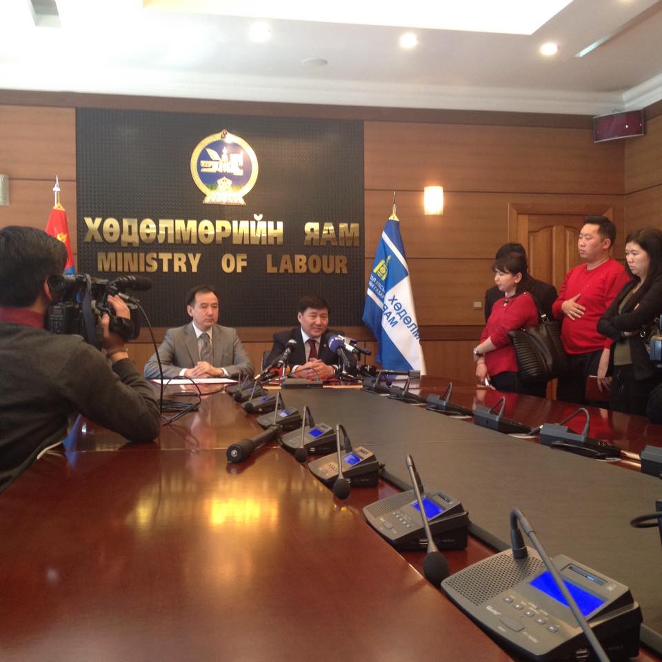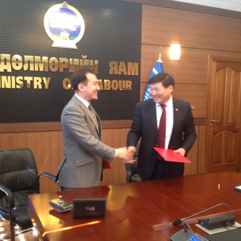 11081676_798574496897507_570608783_nӨнөөдөр Хөдөлмөрийн яаманд Барилга, хот байгуулалтын яамтай хамтран ажиллах санамж бичигт гарын үсэг зурах үйл ажиллагаа болж Хөдөлмөрийн сайд С.Чинзориг, Барилга, хот байгуулалтын сайд Д.Цогтбаатар нар гарын үсэг үзэглэлээ.