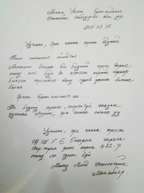 Б.Ганболд “Ц.Мөнхбаяр хоёр удаа Ерөнхийлөгч Ц.Элбэгдоржоос уучлал хүсэх өргөдлийг өгсөн байна. Өнгөрсөн онд тэрээр өөрийн гараараа бичсэн өргөдлөө Шүүхийн шийдвэрээр дамжуулан өгсөн байдаг. Гэтэл үүнийг Ерөнхийлөгч мэдээгүй хэвлэл мэдээлэлд өгсөн ярилцлагадаа хэлсэн байна. Тэрээр Ц.Мөнхбаяр надад хандсан захидал явуулаагүй. Би түүнээс уучлал хүссэн өргөдөл аваагүй гэсэн байна. Гэтэл Ерөнхийлөгчид хандсан хоёр захидлыг тэр хүн мэдээгүй байна гэхээр үүнд Ерөнхийлөгчийн Тамгын газар хайнга хандсан гэж үзэж байна. Энэ бүгдийг эргэн харж, Ц.Мөнхбаяр болон Д.Төмөрбааатар, Г.Болдбаатар нарт уучлал үзүүлээсэй гэж хүсэж байна. Г.Болдбаатарын эрүүл мэндийн байдал хүнд байгаа. Өнөөдрийн хуралд ирсэн бид гурвын энэ хүсэл бол олон мянган иргэдийн төлөөлөл юм. Тэднийг суллахыг иргэд маш ихээр хүсэж байна. Үүнд Ерөнхийлөгч маань уужуу тайван хандаж, дахин энэ асуудалд анхаарал хандуулна гэдэгт итгэж байна. Тиймээс Ц.Мөнхбаярын гурав дахь захидлыг бид өнөөдөр хүргүүлэх гэж байна” гэлээ.