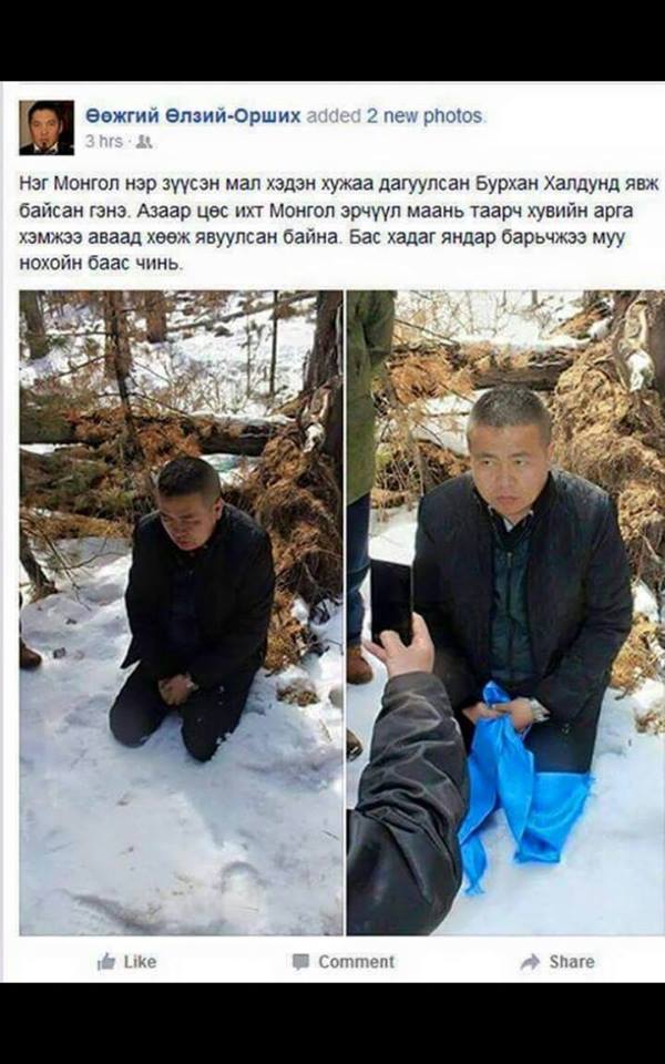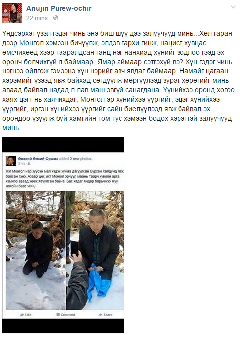 “Нэг Монгол нэр зүүсэн мал хэдэн хужаа дагуулсан Бурхан Халдунд явж байсан гэнэ. Азаар цөс ихт Монгол эрчүүл маань таарч хувийн арга хэмжээ аваад хөөж явуулсан байна. Бас хадаг яндар барьчжээ муу нохойн баас чинь….” хэмээн өчигдөр гитарчин, ая зохиогч Өлзий-Орших өөрийн цахим хуудаснаа хуудаснаа бичсэн. Харин энэхүү сэтгэгдэлийг уншсан зарим хүмүүс Өөжгийг ихээр шүүмжилж зарим нь дэмжиж байсан.