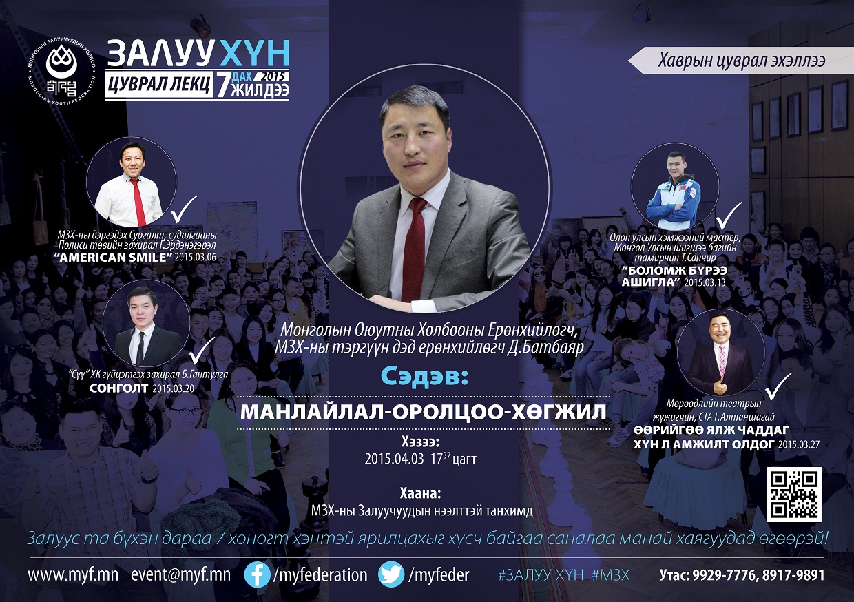 Монголын Залуучуудын Холбооноос уламжлал болгон зохион явуулж ирсэн “Залуу хүн” цуврал лекцийн энэ хаврын тав дахь зочноор шинэхэн үүрэгт ажилдаа томилогдоод буй Монголын Оюутны Холбооны ерөнхийлөгч, МЗХ-ны тэргүүн дэд ерөнхийлөгчөөр сонгогдсон Д.Батбаяр уригдлаа. Тэрбээр “Манлайлал-Оролцоо-Хөгжил” сэдвийн хүрээнд илтгэл тавихаар болсон байна. Залуу хүн цуврал лекц энэ баасан гараг буюу дөрөвдүгээр сарын 3-ны өдрийн 17 цаг 37 минутад МЗХ-ны Залуус танхимд болно. “Залуу хүн” лекцийг сонирхох хүсэлтэй залуусыг онлайнаар бүртгэж байгаа билээ. Иймд энэ хаврын 10 цуврал лекцэнд амжилттайгаар тасралтгүй хамрагдсан залуусыг МЗХ-ны үйл ажиллагаанд нээлттэй хамрагдах эрх олгохын зэрэгцээ батламж гардуулж баталгаажуулахаар болжээ.