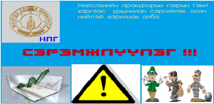 Иймд гэмт хэрэг, зөрчилд холбогдох, гэмт халдлагад өртөхөөс урьдчилан сэргийлэх, өмч хөрөнгийн хадгалалт хамгаалалтаа сайжруулах, орой үдшийн цагаар сонор сэрэмжтэй явахыг Нийслэлийн прокурорын газрын “Гэмт хэргээс урьдчилан сэргийлэх, олон нийттэй харилцах алба”-наас сэрэмжүүлж байна.