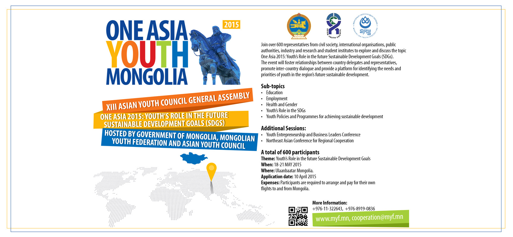 Монгол Улсын Засгийн Газар, Азийн Залуучуудын Зөвлөл, Монголын Залуучуудын Холбоо хамтран зохион байгуулж буй Азийн залуучуудын зөвлөлийн XIII Ерөнхий Чуулганы хүрээнд Зүүн Хойд Азийн Залуучуудын симпиозиумыг тавдугаар сарын 20-ны өдөр зохион байгуулахаар болжээ. МЗХ-ны Ерөнхийлөгч А.Мөнхбат 2014 оны 12-р сард Албани Улсын Тирана хотноо хуралдсан Дэлхийн Залуучуудын Ассемблейн 16-р чуулганы үеэр 2014-2018 оны хугацаанд Азийн асуудал хариуцсан Дэд ерөнхийлөгчөөр сонгогдож ажиллахаар болсон билээ.Иймд МЗХ-ны Ерөнхийлөгч А.Мөнхбат нь Зүүн Хойд Азийн залуучуудын асуудлыг шийдвэрлэхэд өөрсдийн хувь нэмрийг оруулах нь зүйтэй гэж үзсэн тул уг уулзалтыг Монгол Улсад зохион байгуулах санаачлагыг гаргасан юм. Түүнчлэн 2014 оны 6-р сард Улаанбаатарт зохиогдсон Зүүн Хойд Азийн олон улсын эрдэм шинжилгээний бага хурлын үеэр Монгол Улсын Ерөнхийлөгч Ц.Элбэгдоржийн зүгээс “Улаанбаатарын яриа хэлэлцээр” санаачилгыг дэвшүүлсэн юм. Энэхүү санаачлагын гол утга санаа нь Монгол Улс гадаад бодлогын хувьд идэвхтэй байр суурь баримталж, бүс нутгийнхаа аюулгүй байдлын асуудлаар Улаанбаатар хотноо бусад орнуудтай хэлэлцэх нь зүйн хэрэг гэж үзэж байгаа юм.Иймд МЗХ-ноос Монгол Улсын Ерөнхийлөгчийн “Улаанбаатарын яриа хэлэлцээр” санаачлагыг хэрэгжүүлэх ажлыг залуучуудаас эхлэх ёстой гэсэн байр суурьт хүрч “Зүүн Хойд Азийн залуучуудын симпиозиум”-ыг “Нэг Ази 2015” чуулганы хүрээнд зохион байгуулах гэж байна. Уг симпиозиумын хүрээнд Зүүн Хойд Азийн бүс нутгийн хүрээнд тогтвортой хөгжлийг хангахад улс орнуудын залуучуудын хоорондын хамтын ажиллагааг нэмэгдүүлэх, Залуучуудад боловсролын эзэмших боломжуудыг нэмэгдүүлэх, залуучуудын санхүүгийн бие даасан байдлыг дэмжих, Бүс нутгийн залуучуудад тулгамдаж буй саад бэрхшээлүүд, асуудлуудыг тодорхойлж, тэдгээрийг хэрхэн шийдвэрлэх санаачлагуудыг гарган тавих, тэр дундаа уур амьсгалын өөрчлөлт, залуучуудын эрх, улс төрийн болон эдийн засгийн тогвортой байдал зэрэг асуудлуудыг хөндөнө. Ингэсэнээр Монгол Улсын Ерөнхийлөгчөөс дэвшүүлсэн “Улаанбаатарын яриа хэлэлцээр” санааг Зүүн Хойд Азийн залуучуудад ойлгуулан таниулах, Зүүн Хойд Азийн орнуудын залуучуудын хамтын ажиллагааг өргөжүүлэх, Бүс нутгийн аюулгүй байдалд залуучуудын оролцоог нэмэгдүүлэх, “Зүүн Хойд Азийн Залуучуудын хамтын ажиллагааны уулзалт”-ын тунхаг гаргах зэрэг олон талын ач холбогдолтой юм. Уулзалтад Монгол, БНХАУ, Япон, БНСУ, БНАСАУ зэрэг орнуудын төлөөлөгч нар оролцоно.