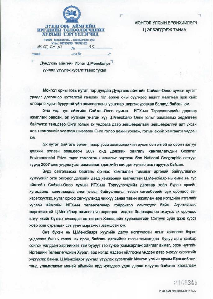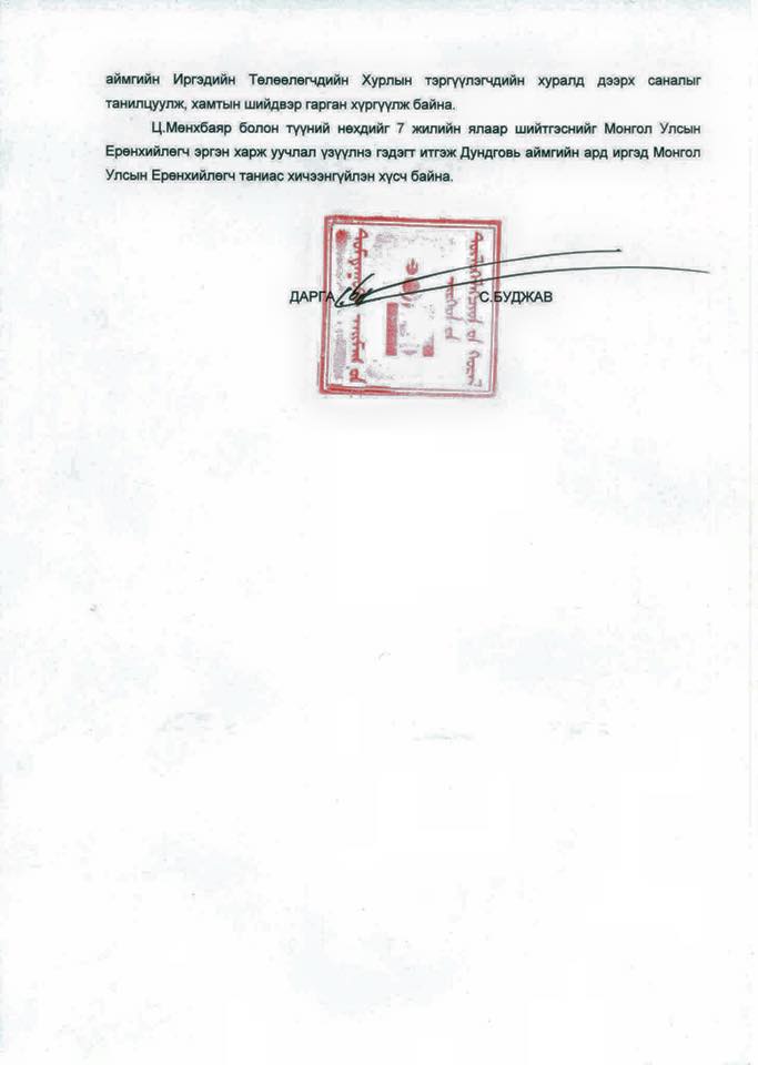 Тэгвэл Дундговь аймгийн ИТХ-ын Тэргүүлэгчдээс Монгол Улсын Ерөнхийлөгч Ц.Элбэгдоржид хандан албан ёсоор Дундговь аймгийн иргэн Ц.Мөнхбаярт уучлалт үзүүлэх талаар албан бичгийг 04 сарын 10-ны өдөр хүргүүлжээ.