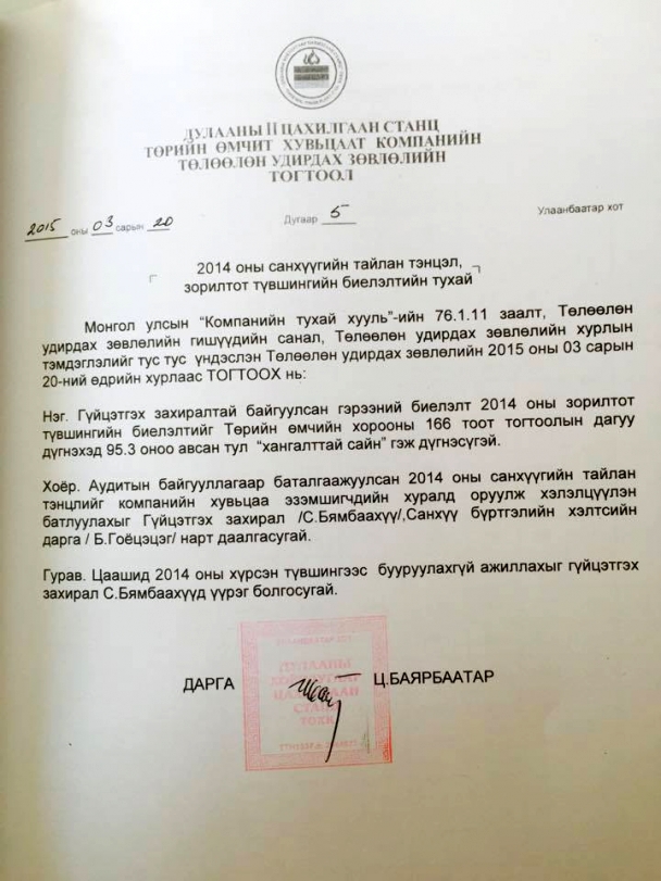 Дулааны II цахилгаан станцын дарга С.Бямбаахүүг үүрэгт ажлаас нь чөлөөлөх тогтоолыг ТӨХ-ноос гаргасан байна. Түүний 2014 оны ажлын биелэлт “хангалтгүй” гэх шалтгаанаар ажлаасаа чөлөөлөгдсөн аж. Энэхүү тогтоолыг ажилтнууд нь мөн эсэргүүцэж байгаа гэнэ. Учир нь тус станцын дарга С.Бямбаахүү нь салбартаа олон ажил ажиллаж байгаа, ТӨХ-ны тогтоолын дагуу гүйцэтгэх захирлын 2014 оны зорилтот түвшингийн биелэлт нь 95.3 хувь гарсан байна. Үүнээс харахад уг станцын дарга С.Бямбаахүүгийн ажлын биелэлт хангалттай гэсэн дүр зурагтай харагдаж байгаа юм. Гэвч тэрбээр Дулааны II цахилгаан станцын даргын ажлыг авч явж чадахгүй байна гэж ТӨХ-ныхон үзэж, халахаар оролдож эхэлсэн нь энэ аж. Ажлаа сайн хийж байгаа гэх дүгнэлт гарчихаад байхад ийнхүү ажлаас нь халж буй нь улс төрийн нөлөөтэй гэж харагдаж байна.