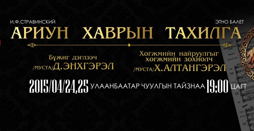 И.Ф.Стравинскийн“Ариун хаврын тахилга” балет нь 1913 онд Парист анх тоглосон үедээ маш их шүүмжлэлийг дагуулж, шуугиан тарьсан ч, хожим нь дэлхийн хөгжмийн түүхэнд шинэ үеийг эхлүүлсэн, хөгжмийн цоо шинэ хэллэгтэй, орчин үеийн балетын дэглэлтэд нөлөөлсөн сод бүтээлд тооцогдох болжээ. Улаанбаатар чуулга Монголд анх удаа энэ балетыг үндэсний хөгжимд найруулж, ардын бүжгийн уламжлалыг модерн бүжигтэй хослуулан тоглох гэж байна.“Ариун хаврын тахилга” балет нь 120 гаруй хүний бүрэлдэхүүнтэй симфони найралд зориулсан бүтээл бөгөөд энэ удаа Улаанбаатар чуулгын 24 хүний бүрэлдэхүүнтэй “Хангарьд” үндэсний найрал хөгжим шинэ найруулгаар тоглох гэж байгаа нь Монголын мэргэжлийн хөгжимчдийн ур чадварыг илтгэн харуулж буй хэрэг юм. Хөгжмийг залуу хөгжмийн зохиолч МУСТА Х.Алтангэрэл найруулж, бүжгийг МУСТА бүжиг дэглээч Д.Энхгэрэл дэглэж, МУ-ын УГЗ, удирдаач Н.Туулайхүү “Хангарьд” үндэсний хөгжмийн найралыг удирдан тоглуулахаар болов