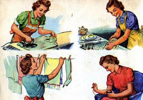 Үнэ хүндгүй ажил гэгдэх гэрийн ажлыг тээр шааж төвөгшөөлгүй хурдан шаламгай гэгч хийнэ. Бидэн шиг наалддаггүй хайруулын таваг, будаа агшаагч, түргэн чанагч, шарах шүүгээ гэж тэдэнд байсангүй. Ганц ширмэн тогоон дээр бүхий л төрлийн хоолоо хийчих нь… Гал дээр ширмэн тогоон дотор будаа агшааж байсан гэвэл итгэх үү? Хагас бүтэн угаалгын машин ч гэж байсангүй паалантай цагаан түмпэнд аль эсвэл хөнгөн цагаан ваннд ус халааж, нидрүүлэг буюу иржгэр төмрөнд гараа цоортол үрэн, угаадаг байсан /иржгэр төмөр гэж тодотгож өгч байгаа маань сүүлийн үеийн охид нидрүүлэг гэж мэдэхгүй байх/ Тэр үед бидний одоо хэрэглээд байгаа энэ олон төрлийн вок байсангүй, тэд хэрэглээний савангаар савандаж угаадаг байсан.