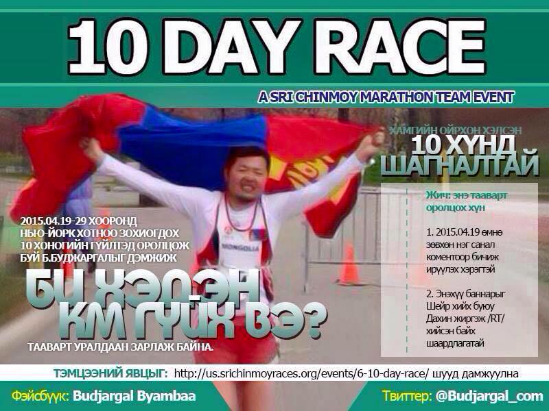 Нью-Йорк хотноо зохиогдож буй энд Монгол улсаа төлөөлөн тамирчин Б.Буджаргал оролцож байна. Тухайн гүйлт нь 10 хоногийн турш 1500 км гүйх юм. “Хөгжлөө эхлүүлцгээе!” Би Монгол улсын хөгжлийн төлөө гэсэн уриатай оролцож байгаа тамирчин маань 5 дахь өдрийхөө гүйлтийг амжилттай үргэлжлүүлсээр байна.