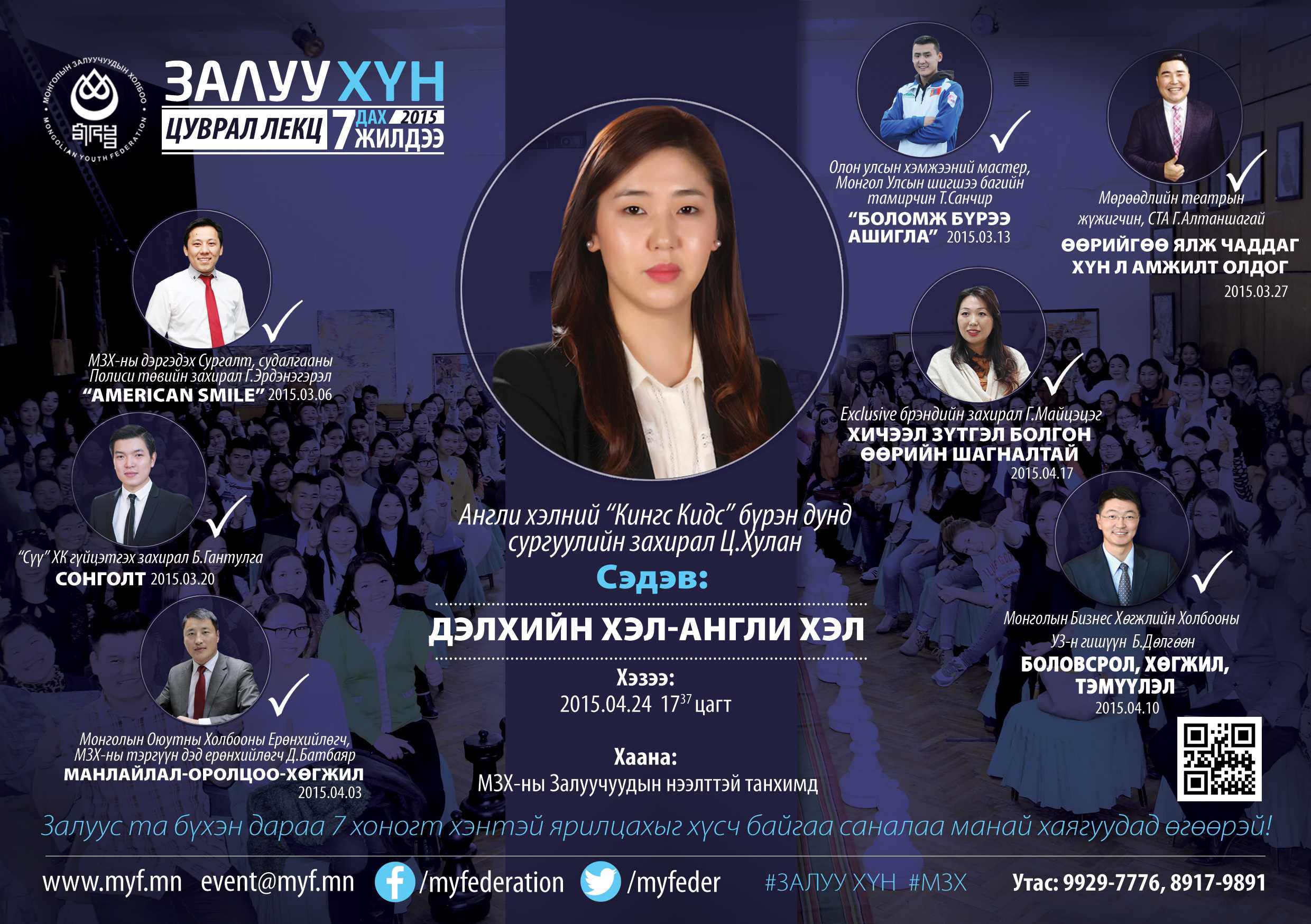 Монголын Залуучуудын Холбооноос уламжлал болгон зохион явуулж ирсэн “Залуу хүн” цуврал лекцийн энэ хаврын найм дахь зочноор “Кинг Кидс” Англи хэлний бүрэн дунд сургуулийн захирал Ц.Хулан уригдлаа.Тэрбээр “Дэлхийн хэл-Англи хэл ” сэдвийн хүрээнд илтгэл тавьж, залуустай нээлттэй ярилцлага өрнүүлэхээр болсон байна. 1998 онд МҮОНТ-ийн эфирээр үеийн олон багачууддаа англи хэл зааж байсан түүнийг мэдэхгүй хүн гэж үгүй бизээ.Англи хэлийг хүн бүр сурахыг хүсч буй энэ цаг үед тус хэлийг төрөлх хэл шигээ эзэмшсэн тэрбээр залуус та бүхэнтэй өөрийн туршлага, мэдлэгээсээ хуваалцах гэж байна. Залуу хүн цуврал лекц баасан гарагийн 17 цаг 37 минутад МЗХ-ны Залуус танхимд болно.