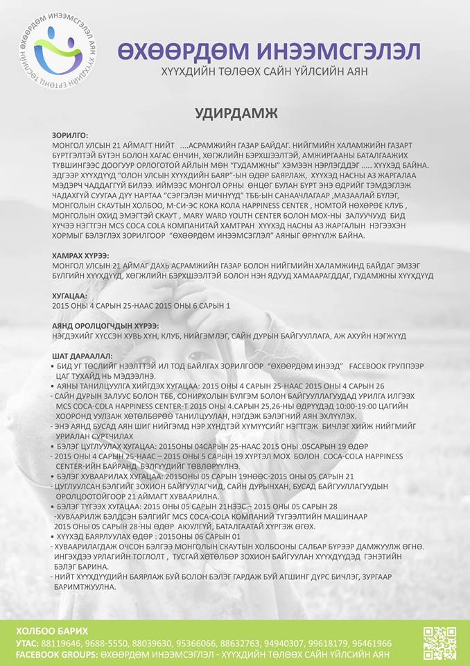 Олон улсын хүүхдийн эрхийг хамгаалах өдрийг тохиолдуулан “Хүүхдийн ертөнц” төслийн хүрээнд” “Сэргэлэн мичнүүд” ТББ-аас санаачлан “Өхөөрдөм инээмсэглэл” аяныг зарлаж байна. Энэхүү аянд Монголын оюутны холбоо, Монголын скаутын холбоо, MCS, “Coca cola” зэрэг байгууллагууд хамтран оролцож байгаа бөгөөд 5-р сарын 24-нөөс 6-р сарын 01 хүртэл явагдана.