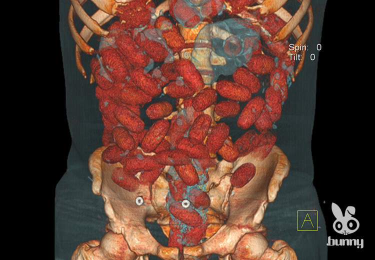 Бразилын цагдаагийн албаныхны авсан энэ зурагт их хэмжээний кокайн биедээ тээж явсан 20 настай Ирланд залуугийн рентген гарсан юм. Бельгийн хилээр гаргах гэж байсан түүний ходоодонд 72 уут буюу 1 кг кокайн байжээ.