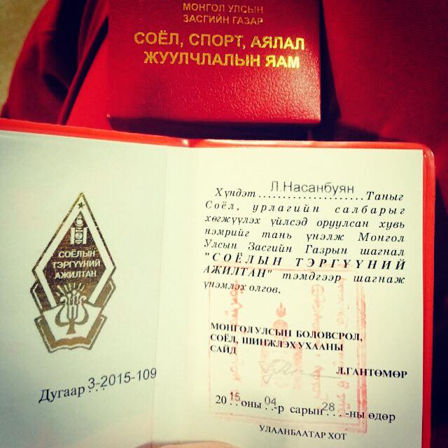 Тэгвэл тэрээр саяхан “Хонгор нутгийн дуулал” тоглолтын үер “Соёлын тэргүүний ажилтан” хэмээх цол тэмдэгээр шагнуулжээ.