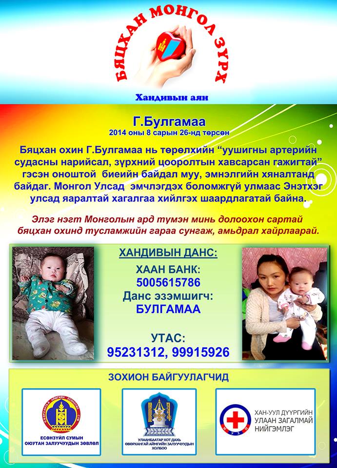 Энэтхэг улсад яаралтай мэс засал хийлгэж, охиныг эмчлүүлэх зардал 50 сая орчим төгрөгийг цуглуулахын тулд сайхан сэтгэлт хүмүүсийн тусламж хэрэгтэй болжээ. Иймээс сайн сэтгэлт залуус нэгдэн “Бяцхан монгол зүрх” аяныг эхлүүлээд, долоохон сартай бяцхан зүрхийг амьдруулах буянтай үйлсэд нэгдэж, сэтгэлийн өглөг, эдгэрэх урам, дэм хайрлахыг сайн сэтгэлт хүмүүн бүхэнд уриалж байна.