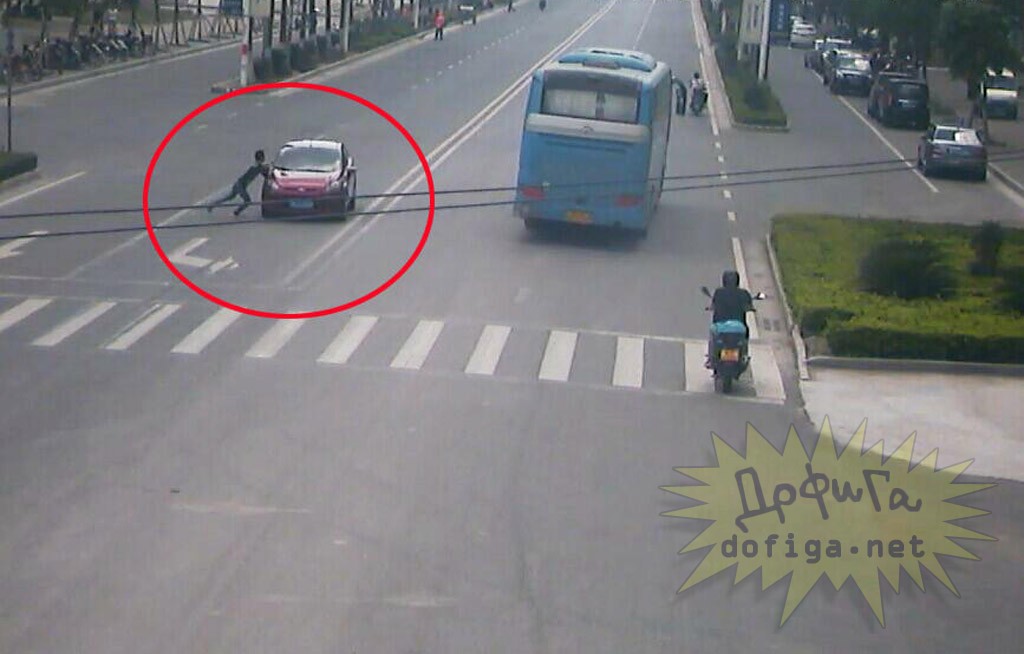403277Хятадын зам дээр нэгэн жаал хүү замаар явж байсан машины дээгүүр үсрэх гэж байгаад дайруулжээ. Машинд мөргүүлсэнийхээ дараа жолоочоос мөнгө нэхэх зорилготой байжээ. Жолооч нь “ Би эмч байна. Яаралтай цагдаа дууд. Би эмчилж өгнө” хэмээсэн байна. Тэрээр хүүг замын хажуугийн бут руу холдуулсан байна. Хятадад машинд мөргүүлэх явдал нилээд их бөгөөд дайруулаад дараа нь  гэмтсэн мэт жүжиглэдэг байна. Ингэснээр маш их хэмжээний нөхөн төлбөр авах боломжтой болдог аж.