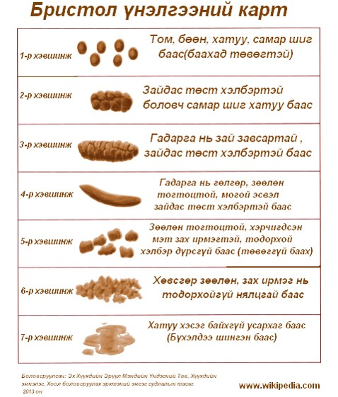 Зураг дээрх 1-3 дугаар хэв шинж нь өтгөн хатсаныг, 4-5 хэв шинж нь хэвийн байдлыг, 6-7 нь шингэн алдалттай байгааг илтгэнэ.
