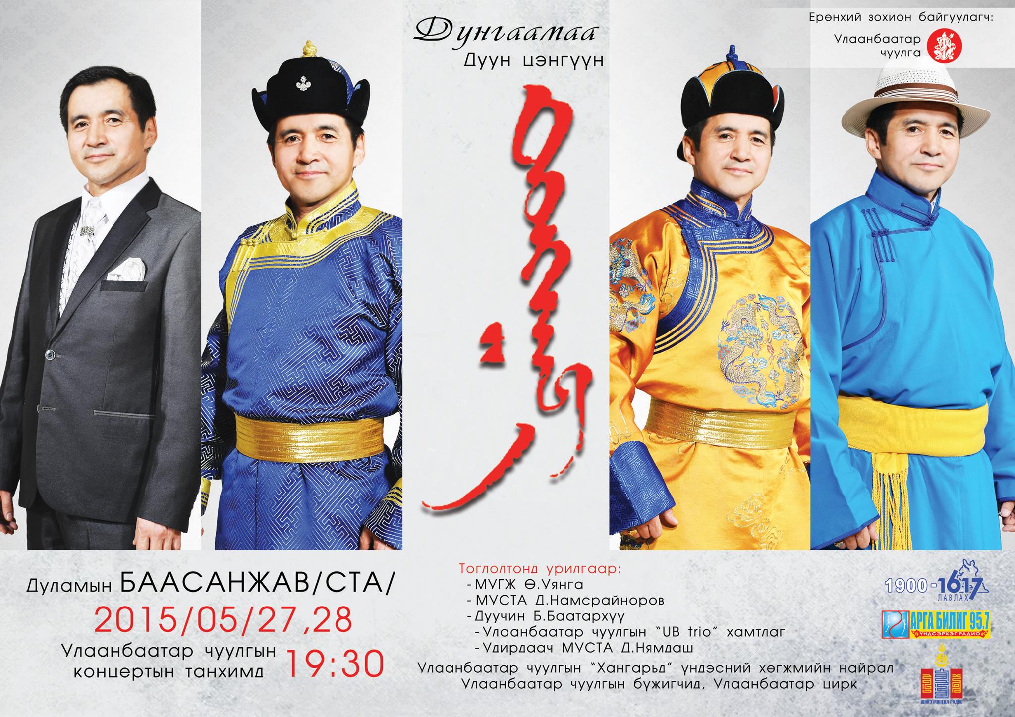 Монголд хамгийн олон “МАА”-г дуундаа мөнхөлсөн Улаанбаатар чуулгын гоцлол дуучин, СТА Дуламын Баасанжав 2015 оны 5-р сарын 27, 28-ны өдөр “Дунгаамаа” дуун цэнгүүнээ Улаанбаатар чуулгын тайзнаа тоглох гэж байна.