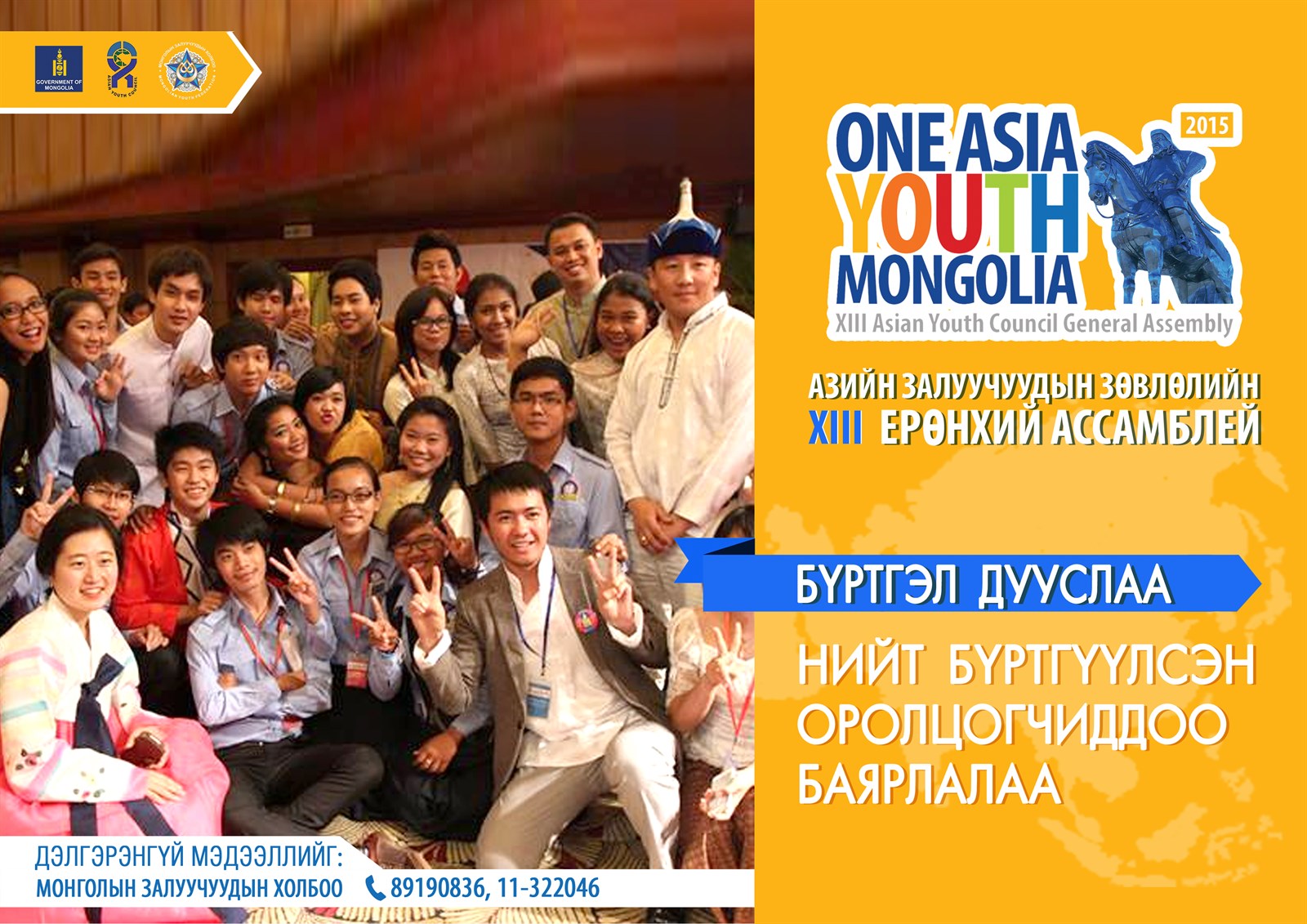 Монгол Улсын Засгийн Газар, Азийн Залуучуудын Зөвлөл, Монголын Залуучуудын Холбоо хамтран Азийн Залуучуудын Зөвлөлийн XIII Ерөнхий Ассамблейг 5-р сарын 18-21-ний өдрүүдэд “Нэг Ази 2015: Тогтвортой хөгжлийн зорилтод залуучуудын оролцоо” сэдвийн дор зохион байгуулахаар болсон билээ. Уг чуулган эхлэхэд 5 хоног үлдээд байгаа бөгөөд чуулганд оролцох оролцогчдын бүртгэл өчигдөр дууслаа. Бүртгэл 2015.04.11-2015.05.12 хооронд Монголын Залуучуудын холбооны үндсэн сайт болох myf.mn сайтад онлайнаар явагдсан юм.