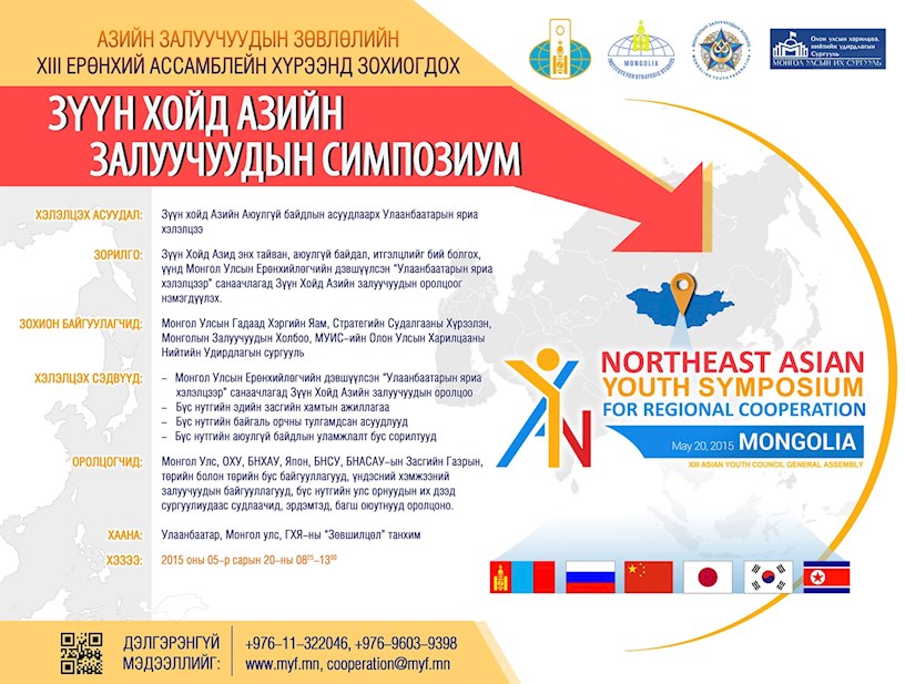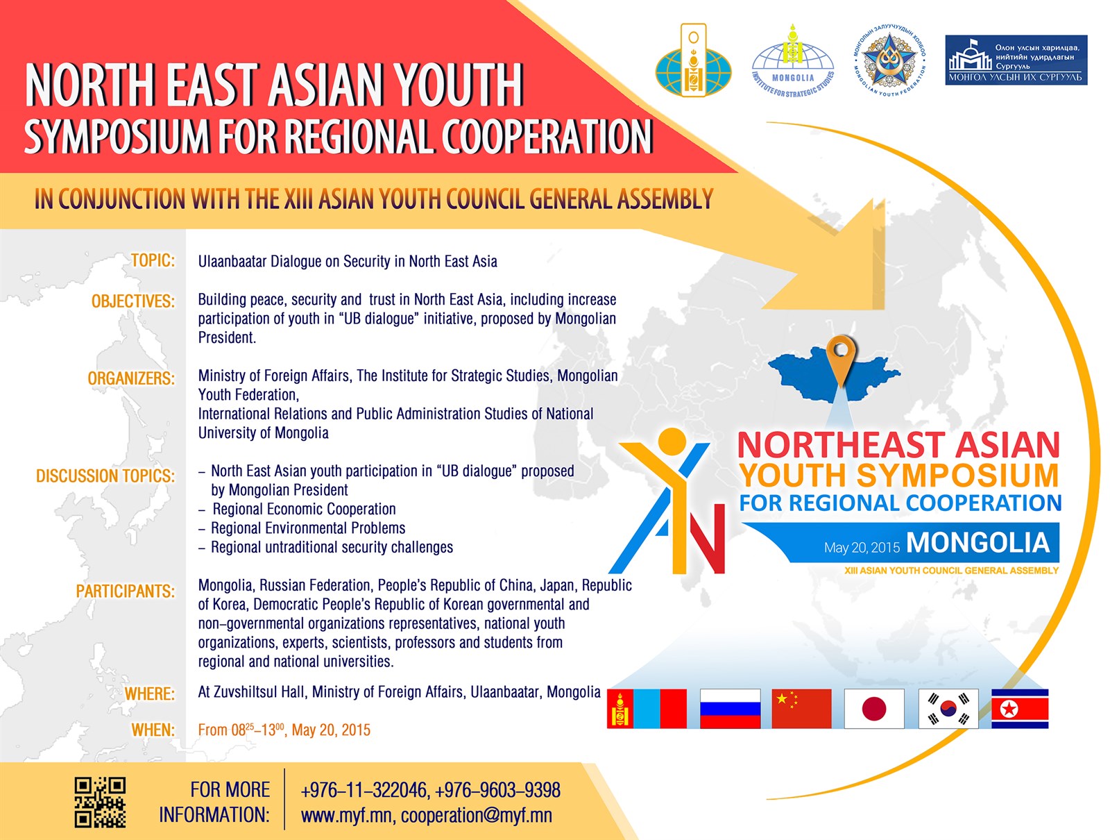 Азийн Залуучуудын Зөвлөлийн XIII Ерөнхий Ассамблей “Нэг Ази-2015: Тогтвортой хөгжлийн зорилтод залуучуудын оролцоо” сэдвийн дор Монгол Улсад зохион байгуулагдах гэж байгаа билээ. Ассамблейд Азийн 23 улс орны залуус оролцоно. Иймд тус ассамблейн хүрээнд Зүүн Хойд Азийн Залуучуудын симпозиум зохион байгуулах гэж байна. Энэхүү симпозиумыг зохион байгуулснаар Зүүн Хойд Азид энх тайван, аюулгүй байдал, итгэлцлийг бий болгох, Монгол Улсын Ерөнхийлөгчийн дэвшүүлсэн “Улаанбаатарын яриа хэлэлцээ” санаачлагад Зүүн Хойд Азийн залуучуудын оролцоог нэмэгдүүлнэ гэж зохион байгуулагчид тэмдэглэж байна.