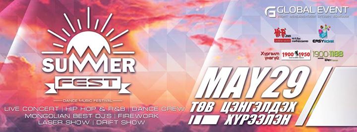 Энэ зуны задгай нээлтийн хөгжмийн наадам – Summer Fest 2015 Улаанбаатарын хотын маань Төв цэнгэлдэх хүрээлэнд 2015 оны 5-р сарын 29-ны 19 цагаас болно. Монголын хөгжмийн урлагын сор болсон уран бүтээлчид оролцох нээлтийн шоу, хөгжим, Dj, бүжгийн наадмыг зохион байгуулахаар ажиллаж байгаа юм. Удтал хүлээсэн зуны улиралын нээлтийг хотын залуус маань төв цэнгэлдэх хүрээлэндээ нээхээр тэсэн ядан хүлээж байна. Summer Fest 2015 шоу фестивалд амьд хөгжим, hip hop, R&B, Mongolian Best DJ’s, шилдэг бүжигчид, усны хувцасны халуухан шоу, лазер гэрлийн шоу зэрэг сонирхолтой арга хэмжээнүүдийг багтаан олон улсын томоохон фестивалуудын адил шинэлэг, сонирхолтой сонирхолтой байдлаар зохион байгуулах юм байна. Их хотын залуусаа SUMMER FEST 2015 зуны нээлтийн шоу фестивалд хүрэлцэн ирж мянга мянган залуусын давалгаанд нэгдэхийг урьж байна. Тасалбарыг 1900-1950 лавлах үнэгүй хүргэлт, HiFi –ын салбаруудаар болон www.easyticket.mn -с худалдан аваарай.УТАС:9903-1800