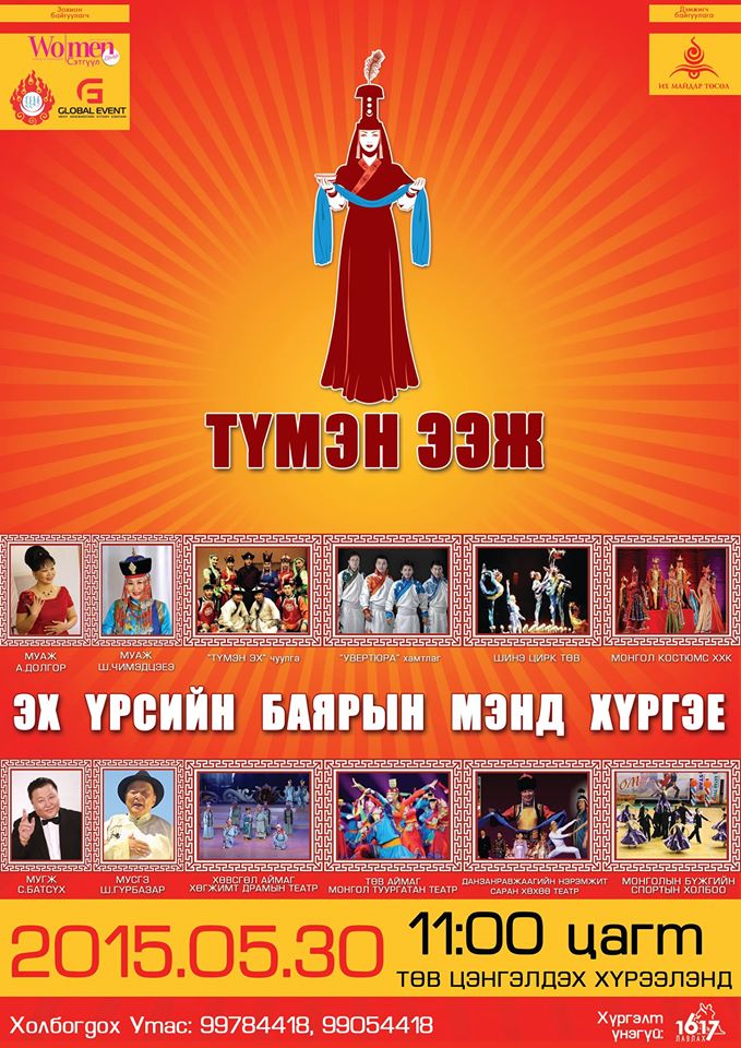 Эх үрсийн баярт зориулан МУАЖ А.ДОЛГОР, МУАЖ Ш.ЧИМЭДЦЭЕЭ, МУГЖ С.БАТСҮХ, МУСГЗ Ш.ГҮРБАЗАР, Увертюра хамтлаг, Данзанравжаагийн нэрэмжит Саран хөхөө театр, Төв аймгийн Монгол туурагтан театр, Хөвсгөл аймгийн хөгжимт драмын театр, Хэнтэй аймгийн Хан хэнтий театр, Шинэ цирк төв, монголын бүжгийн спортын холбоо зэрэг урлаг соёлын алдартанууд болон уран бүтээлчид нэгдэн 2015 оны 5-р сарын 30-ны 11 цагт Төв цэнгэлдэх хүрээлэнд “ТҮМЭН ЭЭЖ” хүндэтгэлийн үндэсний анхдугаар дуун цэнгүүнийг Эмэгтэйчүүд сэтгүүл, Их майдар төслийн дэмжлэгтэйгээр зохион байгуулна. Тус дуун цэнгүүнд 300 гаруй уран бүтээлчид баярын жагсаалаар болон дуун цэнгүүнээр бэлэг барина. Дуун цэнгүүнд 21 аймаг, 9 дүүргийн иргэдийг хүрэлцэн ирж үзэж сонирхохыг урьж байна. Ээжийнхээ хамтаар заавал үзэх тоглолт. Тоглолтын тасалбарыг 1900-1617 лавлах үнэгүй хүргэлт, Төв гандан доторх Их майдар төслийн сурталчилгааны цэгээс, Hi-Fi бүх салбараар, www.easyticket.mn –с сонгон 15,000 төгрөгөөр аваарай. Утас: 9905-4418