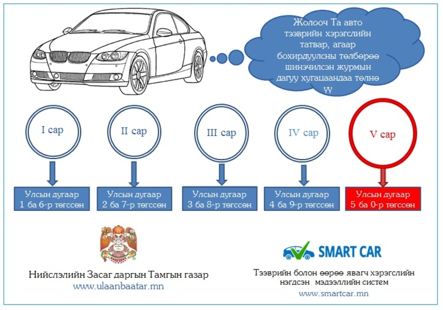Уг хуулийг хэрэгжүүлэх, иргэдэд банкинд дараалал үүсгэж цаг хугацаа алдахгүй байх боломжоор хангах зорилгоор автомашины улсын дугаарын сүүлийн оронгоос хамаарч төлөх шинэчилсэн журмыг Нийслэлийн ИТХ-ын Тэргүүлэгчдийн 2015 оны 01-р сарын 26-ны өдрийн 28 дугаар тогтоолоор баталсан.