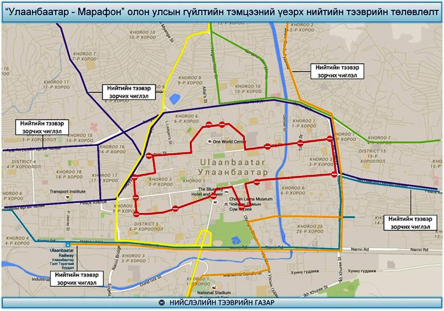 Нийслэлийн Засаг даргын 2015 оны 02 дугаар сарын 09-ний өдрийн А/121 дүгээр захирамжаар баталсан “Найрсаг Улаанбаатар” хөтөлбөрийн хүрээнд жил бүр зохион байгуулагддаг “Улаанбаатар марафон-2015” 06 дугаар сарын 06-ны өдөр болно. “Улаанбаатар марафон-2015”-ын үйл ажиллагаатай холбоотойгоор Бага тойруу, Энхтайваны өргөн чөлөө, Сөүлийн гудамж, Бээжингийн гудамж, Анкарагийн гудамж, Самбуугийн гудамжаар үйлчилгээ үзүүлдэг нийт 51 чиглэлд өөрчлөлт оруулж, нийтийн тээврийн нийт 676 тээврийн хэрэгсэл үйлчилгээнд ажиллахаар төлөвлөлт хийгдээд байна.