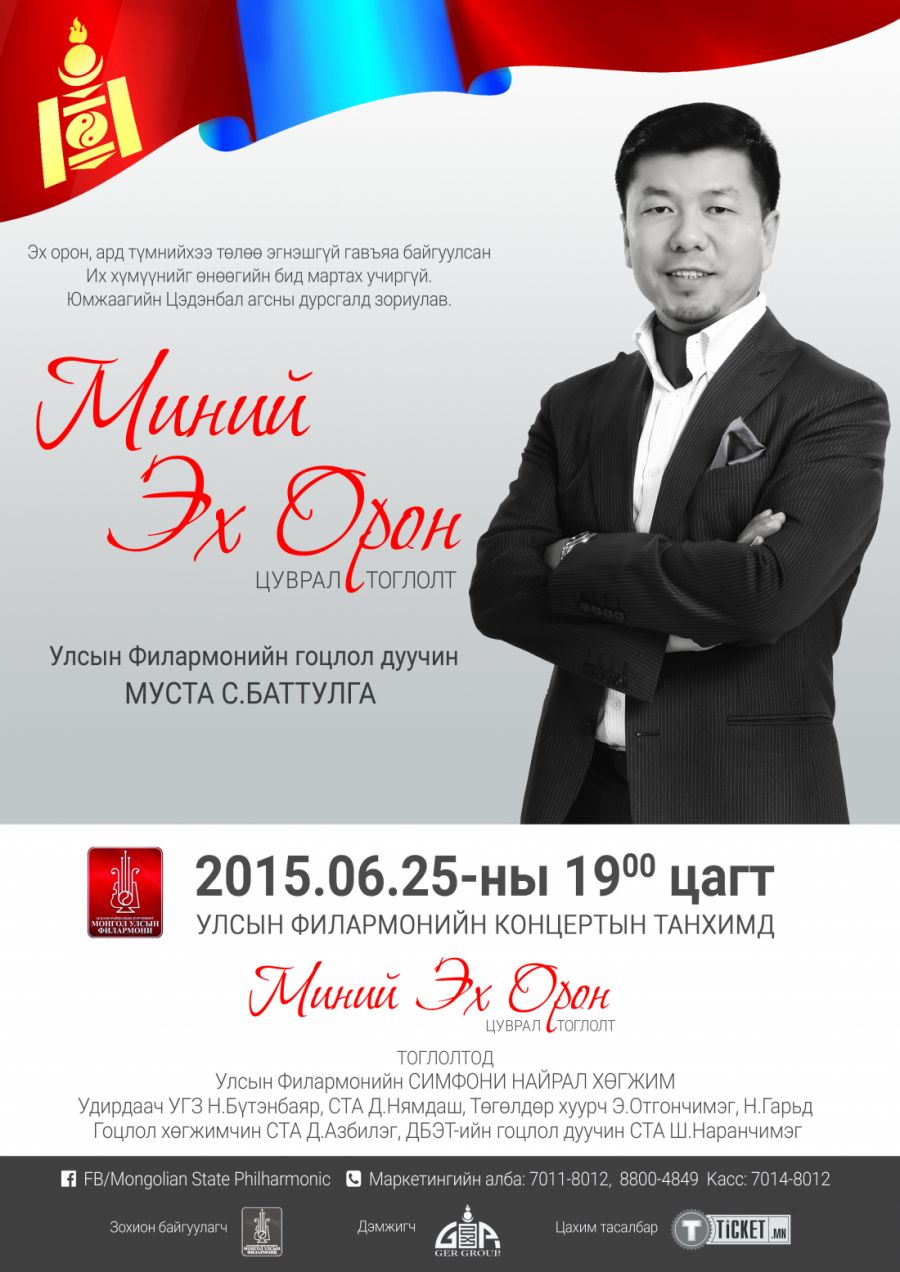 Улсын Филармонийн гоцлол дуучин МУСТА С.Баттулга “МИНИЙ ЭХ ОРОН” цуврал тоглолтоо үргэлжлүүлж байна. Тэрбээр энэ удаагийн тоглолтоо Улсын Филармонийн концертын танхимд энэ сарын 25-ны 19:00 цаг дор хийхээр зар түгээж байна. Олон сайхан дуу түмэнд хүргэж дуугаар жигүүрлэж, дуугаар амьдарч явдаг уран бүтээлч залуу энэ удаагийн “Миний эх орон” тоглолтоо Юмжаагийн Цэдэнбал агсны дурсгалд зориулж байгаа нь сонин шийдэл аж. “Эх орон, ард түмнийхээ төлөө эгнэшгүй гавьяа байгуулсан Их хүмүүнийг бид мартах учиргүй” хэмээн төрийн тэргүүн агсныг эрхэмлэн хүндэтгэж байна.