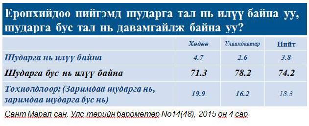 Ерөнхийдөө нийгэмд шудрага тал нь илүү байна гэж дөнгөж4-хөн хувь нь хариулжээ.