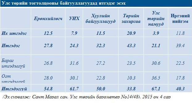 Шүүмжилсэн нь л тодроод байхаас биш хийсэн нь хэрүүл хараалын бай болдог болж. Шудрага ёсыг хангах ёстой төрийн байгууллагууд  ч итгэлээ алдаж, бүхий л өндөрлөгүүдэд нь иргэд итгэхээ больж байгаа нь эдийн засгийн хямралаас ч илүү итгэлцэлийн хямралын харанга болж байна.