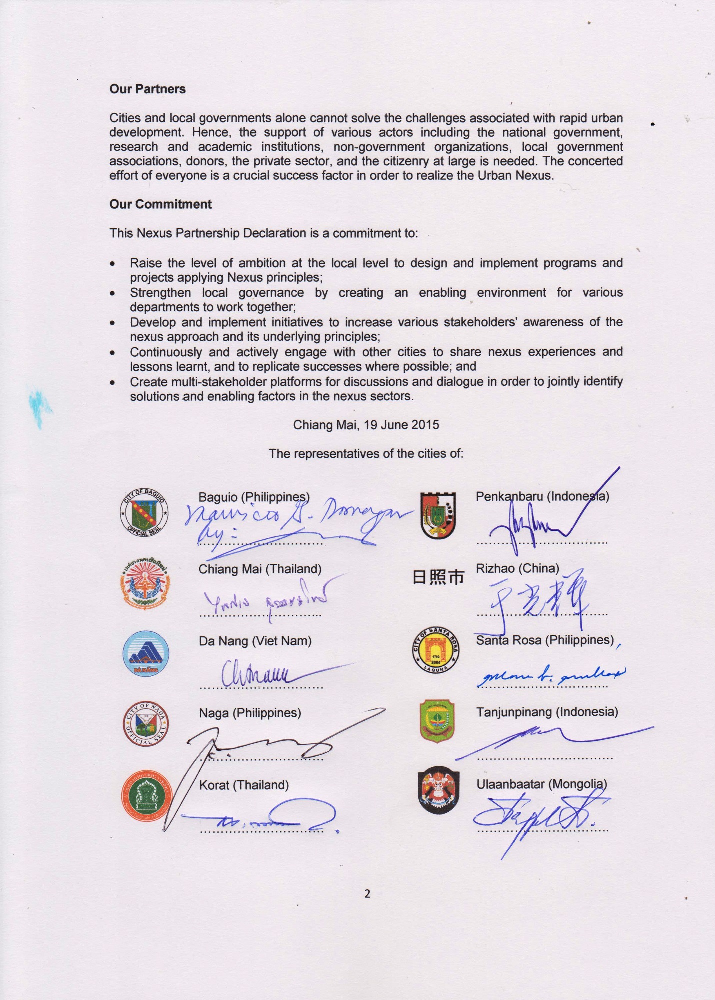 Хурлын үеэр Nexus төсөлд хамрагдаж буй Ази, Номхон Далайн бүсийн 6 орны 10 хот нөөцийн цогц менежментийг хөгжүүлэх хамтарсан тунхаглалд гарын үсэг зурах арга хэмжээ боллоо. Улаанбаатар хотыг төлөөлж уг тунхаглалд Улаанбаатар Хотын Ерөнхий менежер бөгөөд Захирагчийн Б.Бадрал гарын үсэг зурлаа.