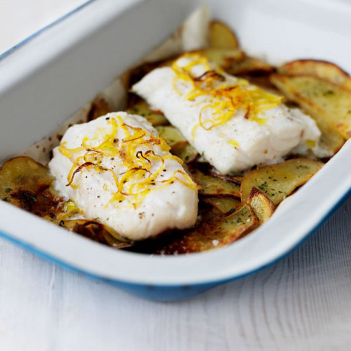 2. Загасан дээрэ нимбэгний хальсны үйрмэг, давс, перец цацаж өгнө. Төмстэй тэвшин дээрээ тавиад дээр нь нимбэгний шүүс асгаад 10 минут болгоно. Энэ үед загас чийглэг хэвээрээ байгаа хирнээ, багахан хэсгүүдээ хатуурч шарагдсан байх ёстой. Тэвшнээс гаргаж олгоно.